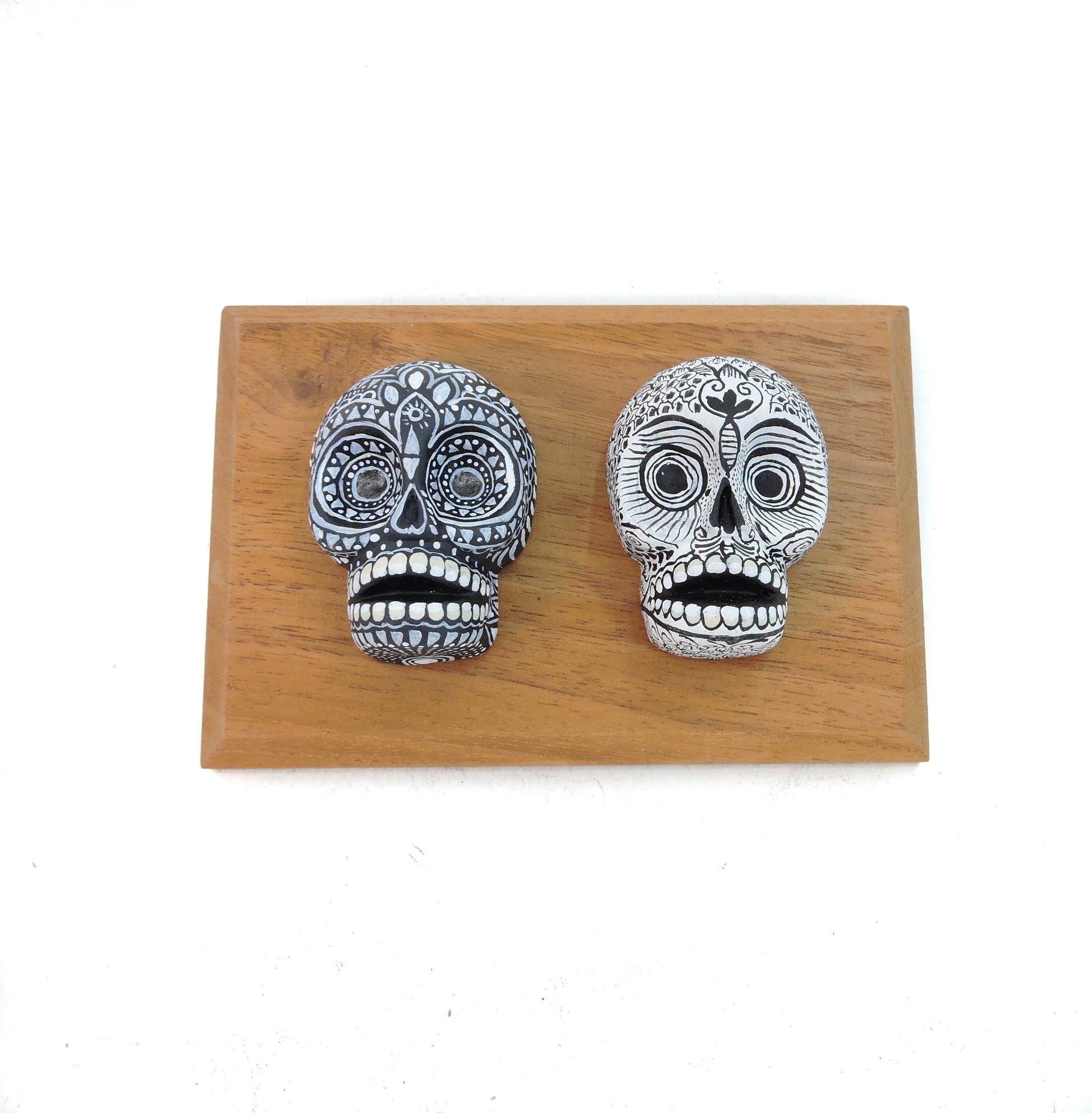 Hermosas calaveras elaboradas a mano en barro de alta temperatura, cada pieza fue pintada a mano con un estilo unico y especial, cada cuadro tiene unas medidas aproximadas, de 15x10 cm, cuentan con una base de madera fina, cada pieza puede colgarse de manera individual en la pared al gusto, lleva a tu hogar una pieza unica y llena de color