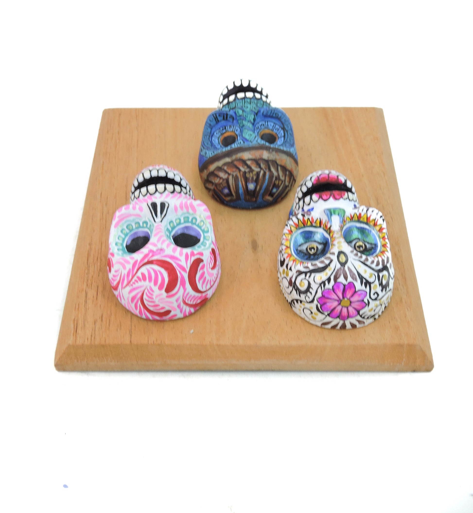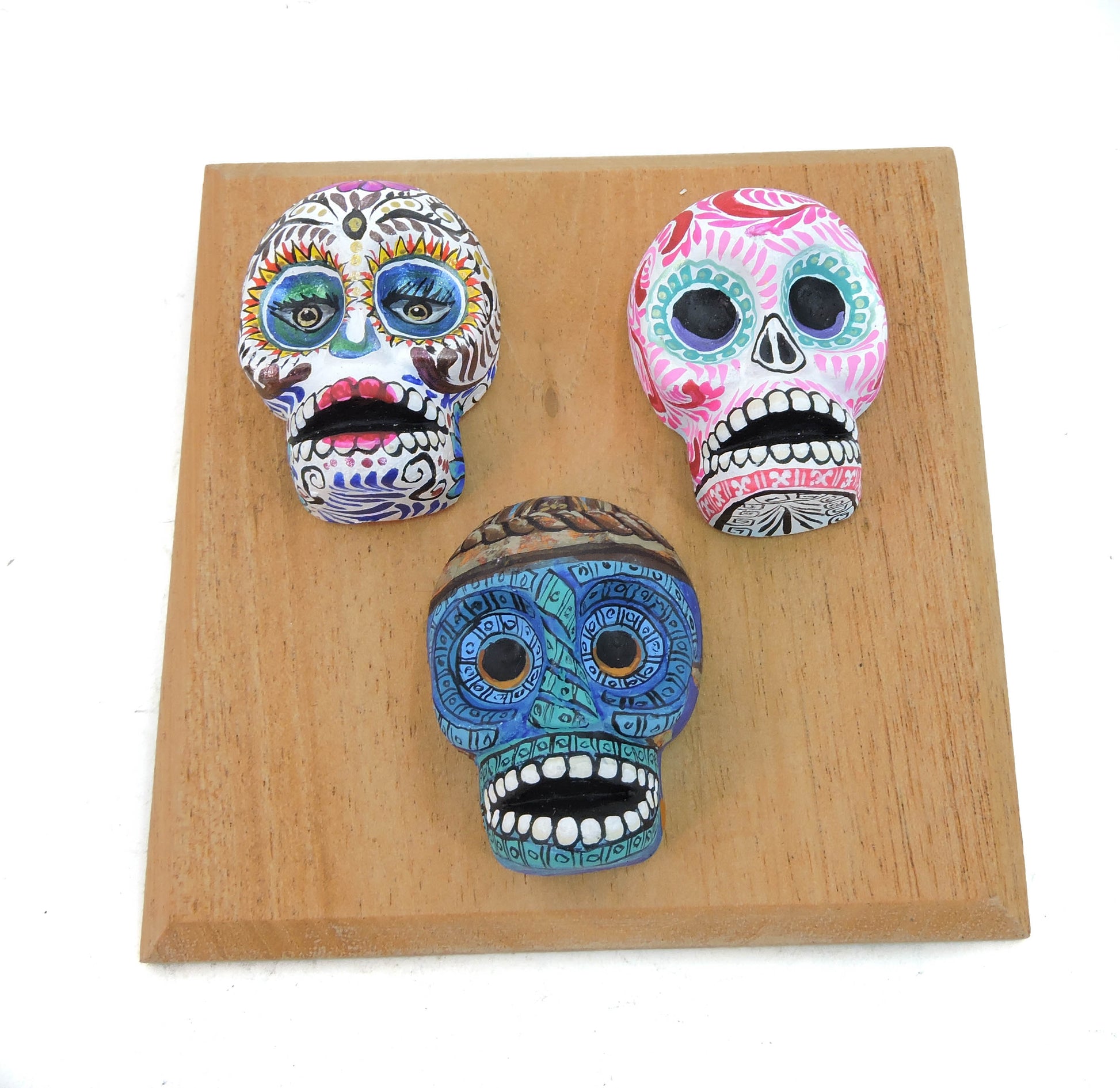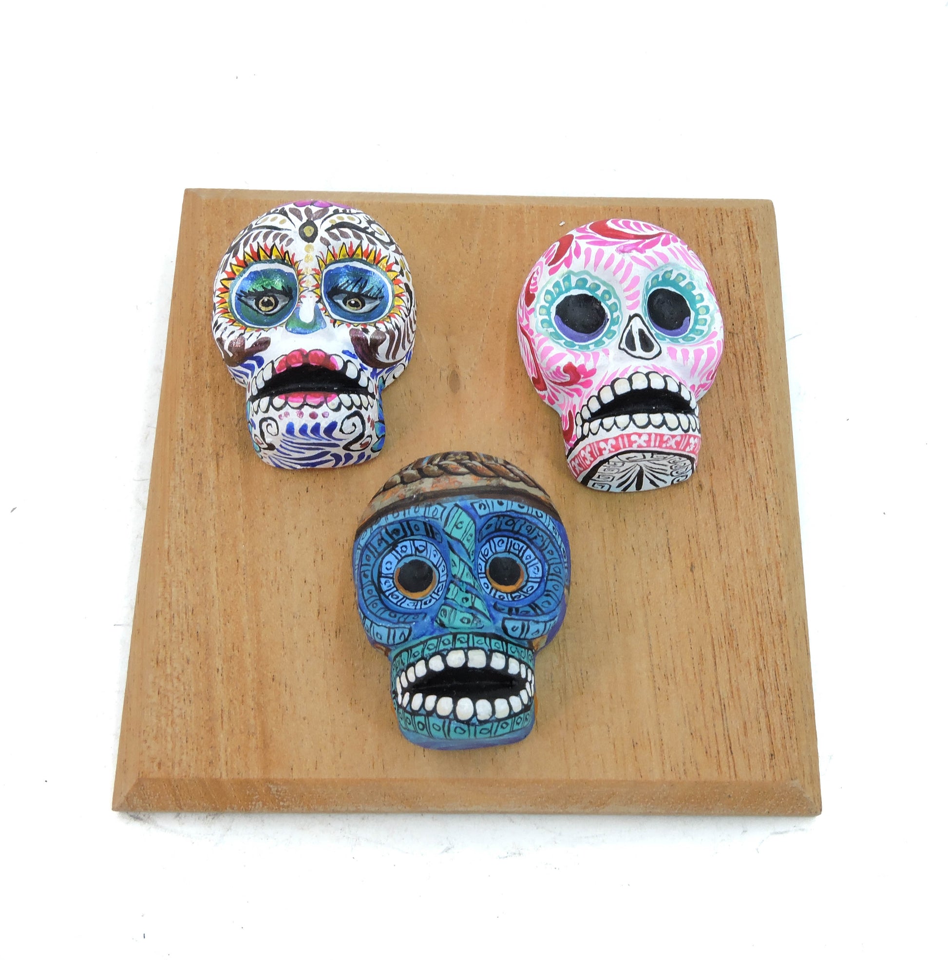 Hermosas calaveras elaboradas a mano en barro de alta temperatura, cada pieza fue pintada a mano con un estilo unico y especial, cada cuadro tiene unas medidas aproximadas, de 18x18 cm, cuentan con una base de madera fina, cada pieza puede colgarse de manera individual en la pared al gusto, lleva a tu hogar una pieza unica y llena de color