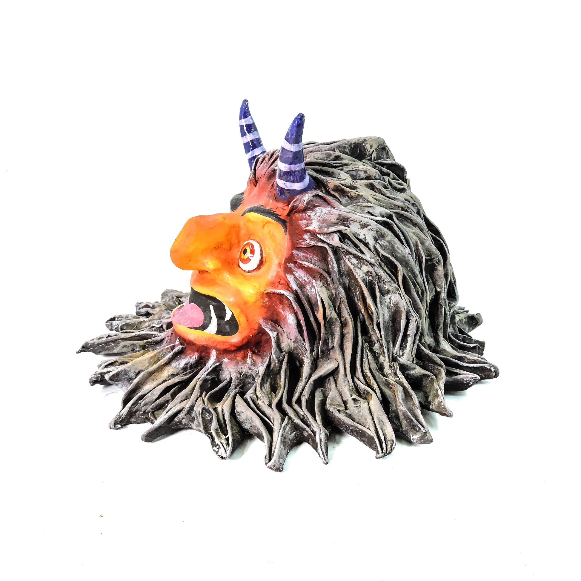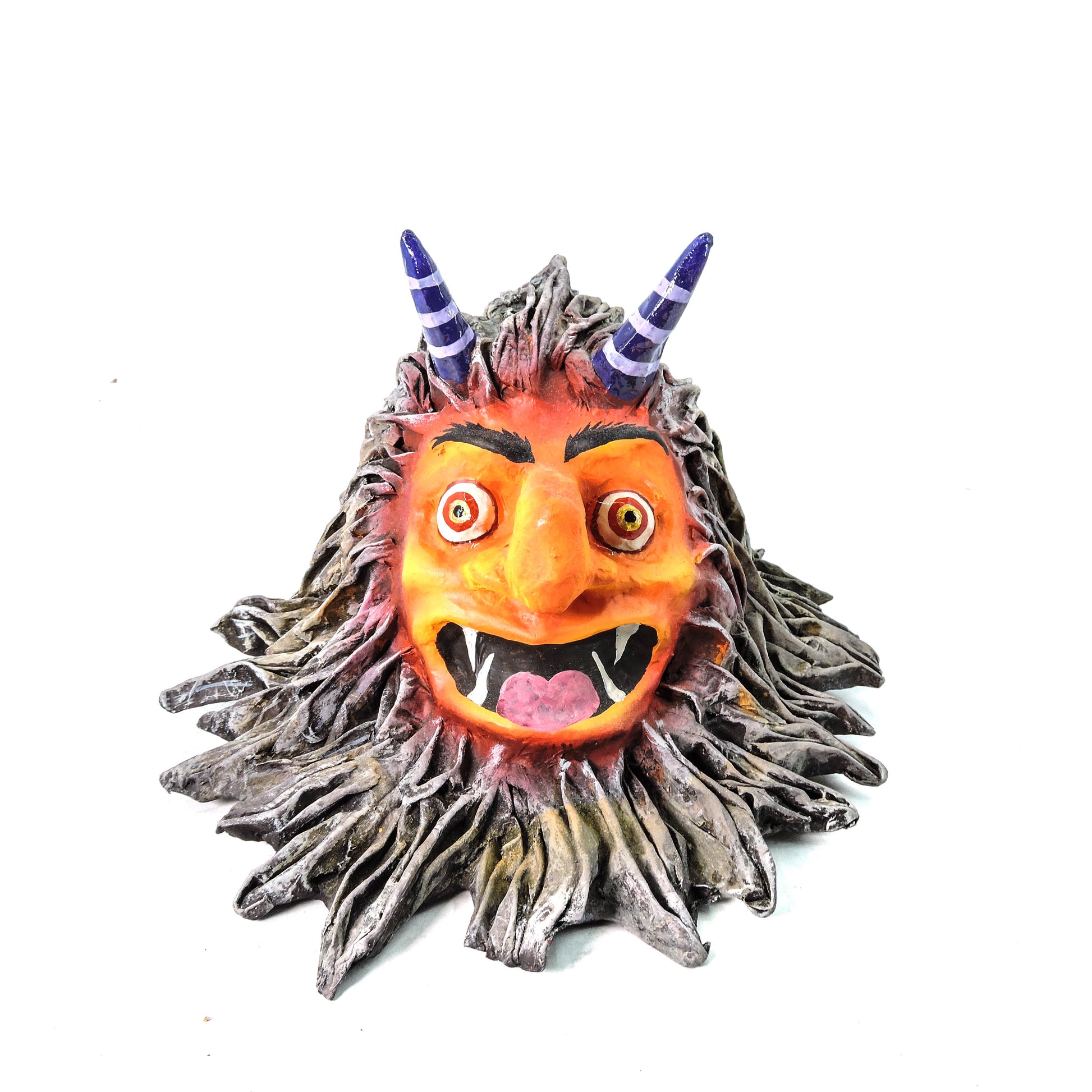 Esta pieza es una reinterpretación vibrante de las máscaras tradicionales, creada e intervenida a mano por el taller Nahualcalli. Con una expresión desbordante de energía, colmillos afilados y cuernos a rayas que contrastan con su cabellera salvaje, esta figura encarna la fuerza lúdica y caótica del carnaval, del espíritu y del mito. Su paleta de colores intensos y su acabado texturizado refuerzan su carácter expresivo y desafiante.