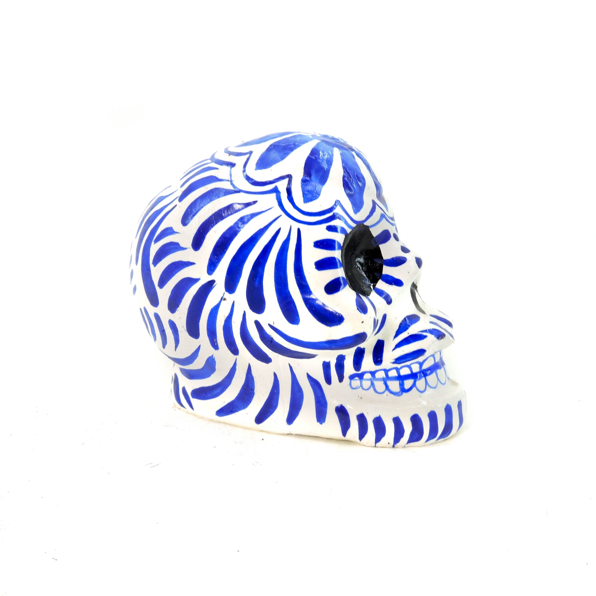 Hermosas calaveras, elaboradas en barro cocido, por artesanos del estado de Guerrero, pintadas y decoradas a mano por artesanos del Taller Nahualcalli, en el estado de México, estas piezas son una fusion de la cultura y las artesanias de guerrero, tanto como del estilo particular decoracion del taller, las piezas miden
