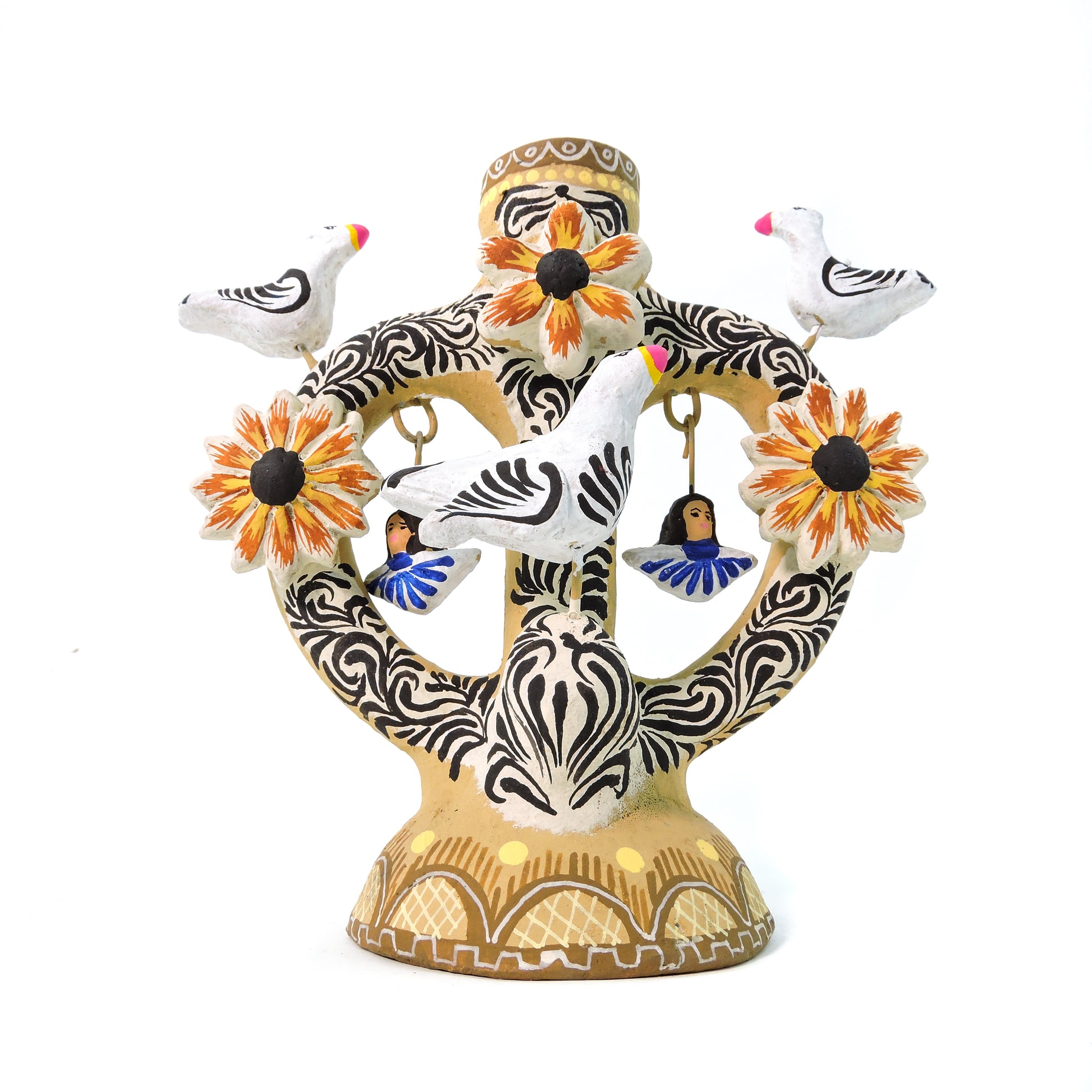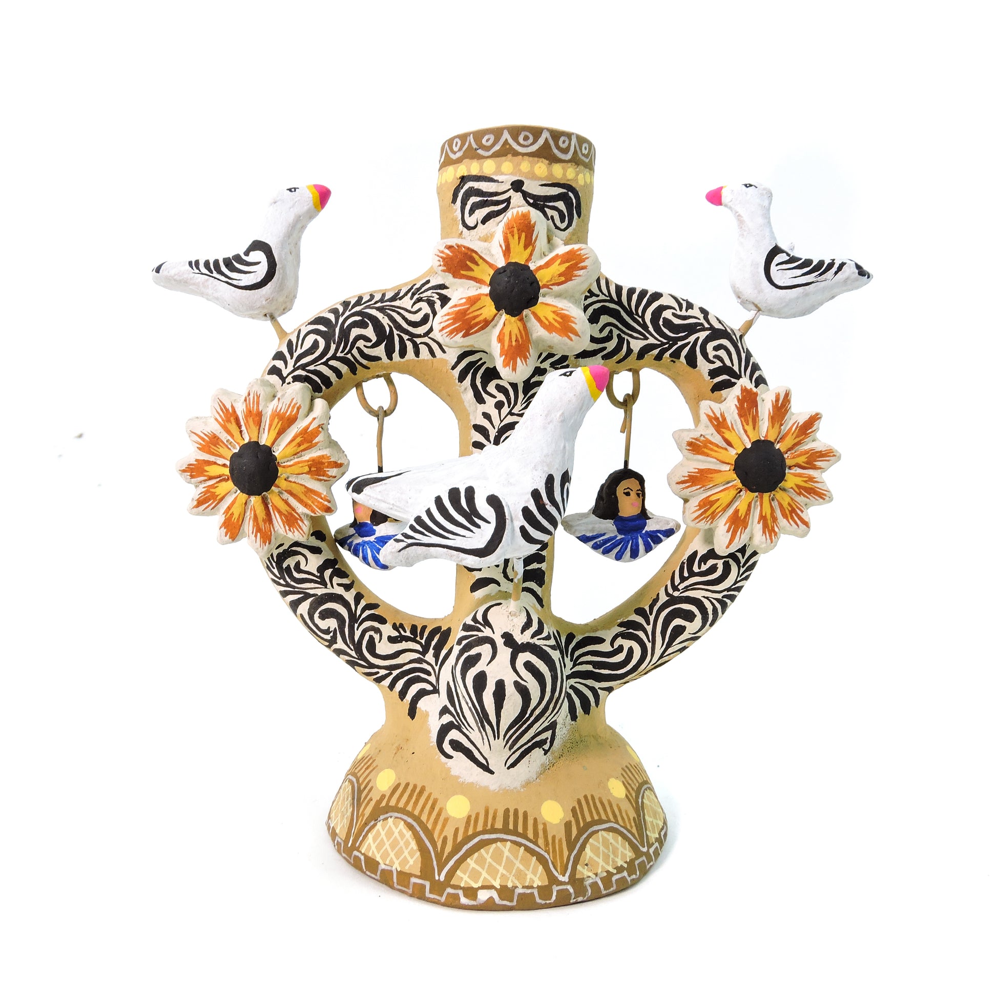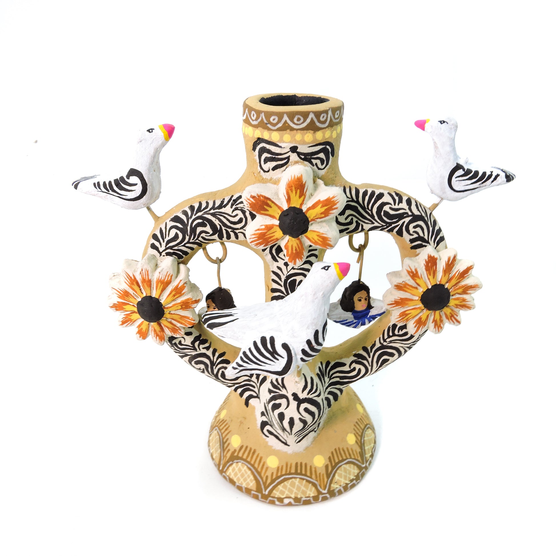 Hermosa artesanía, elaborada en el estado de Metepec, pintada por artesanos del estado de México, para elaborar este tipo de trabajo a mano se realizan los brazos, asi como el soporte para la vela y varias piezas, algunas otras son elaboradas con molde en la técnica de pastillaje, la elaboración de este tipo de piezas lleva un proceso de 1 a 2 meses, la pintura se realiza a mano con pintura acrílica de alta calidad para evitar el deterioro de la pieza, un producto hermoso totalmente artesanal que resalta en cualquier espacio de tu hogar