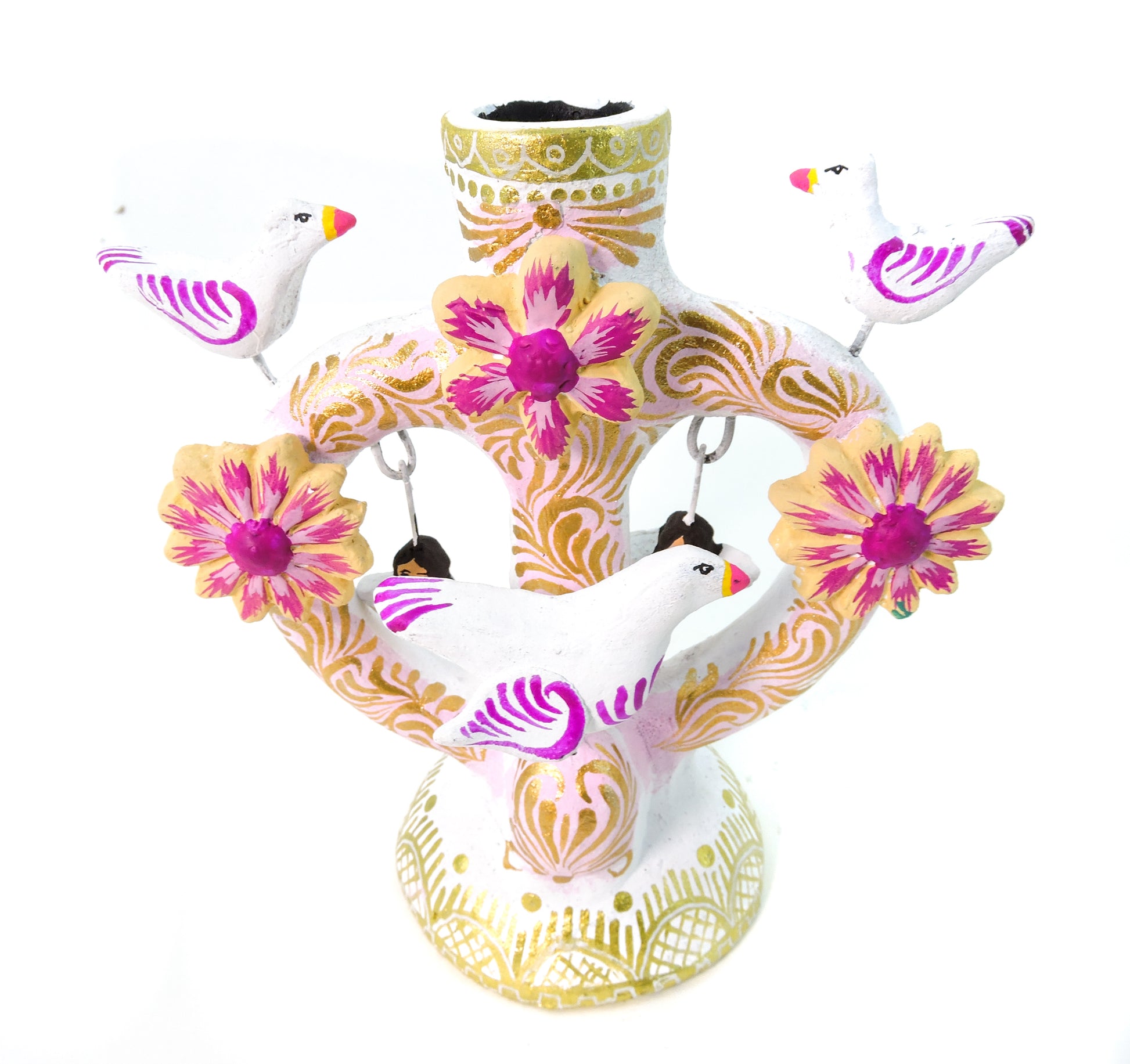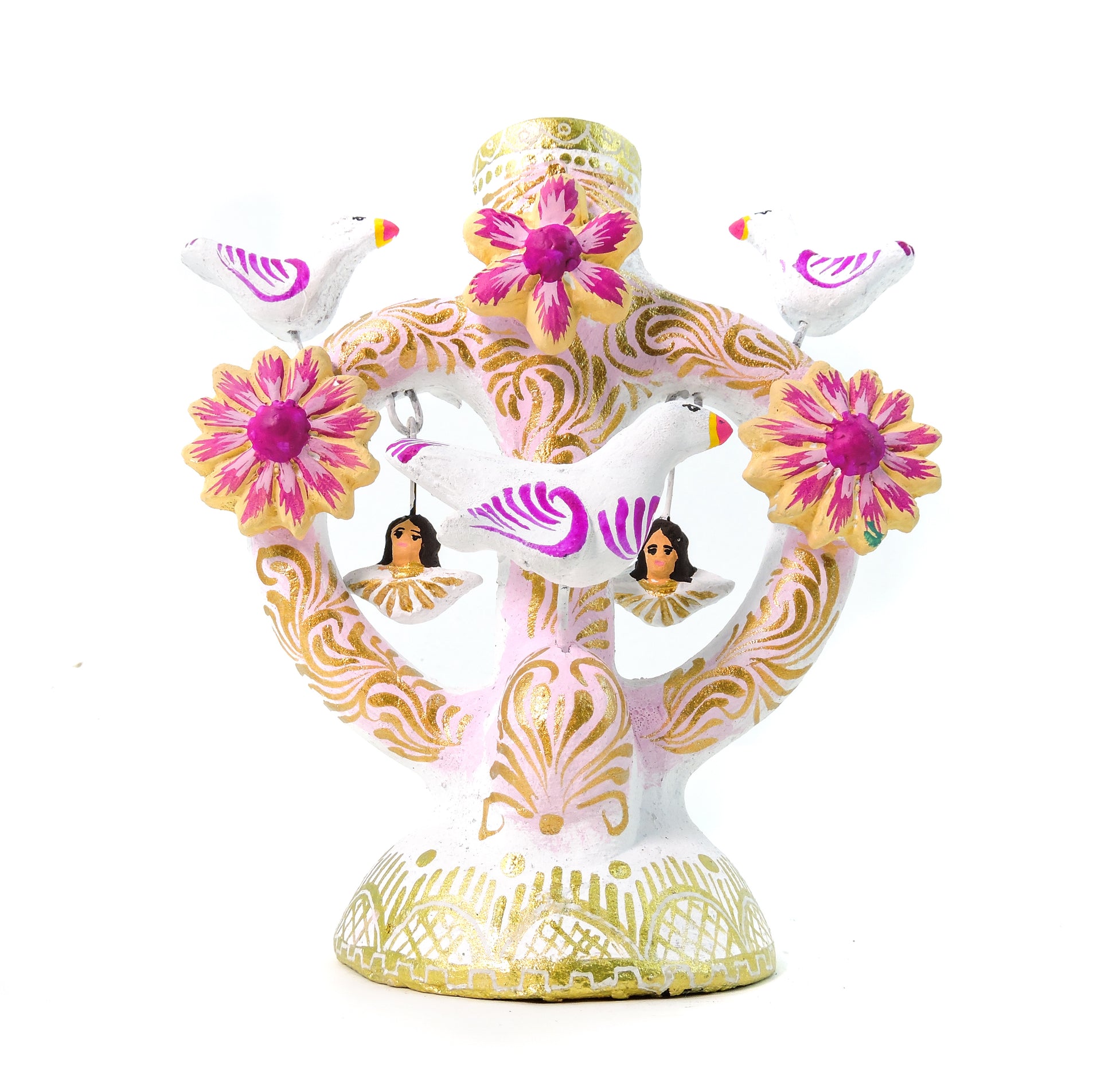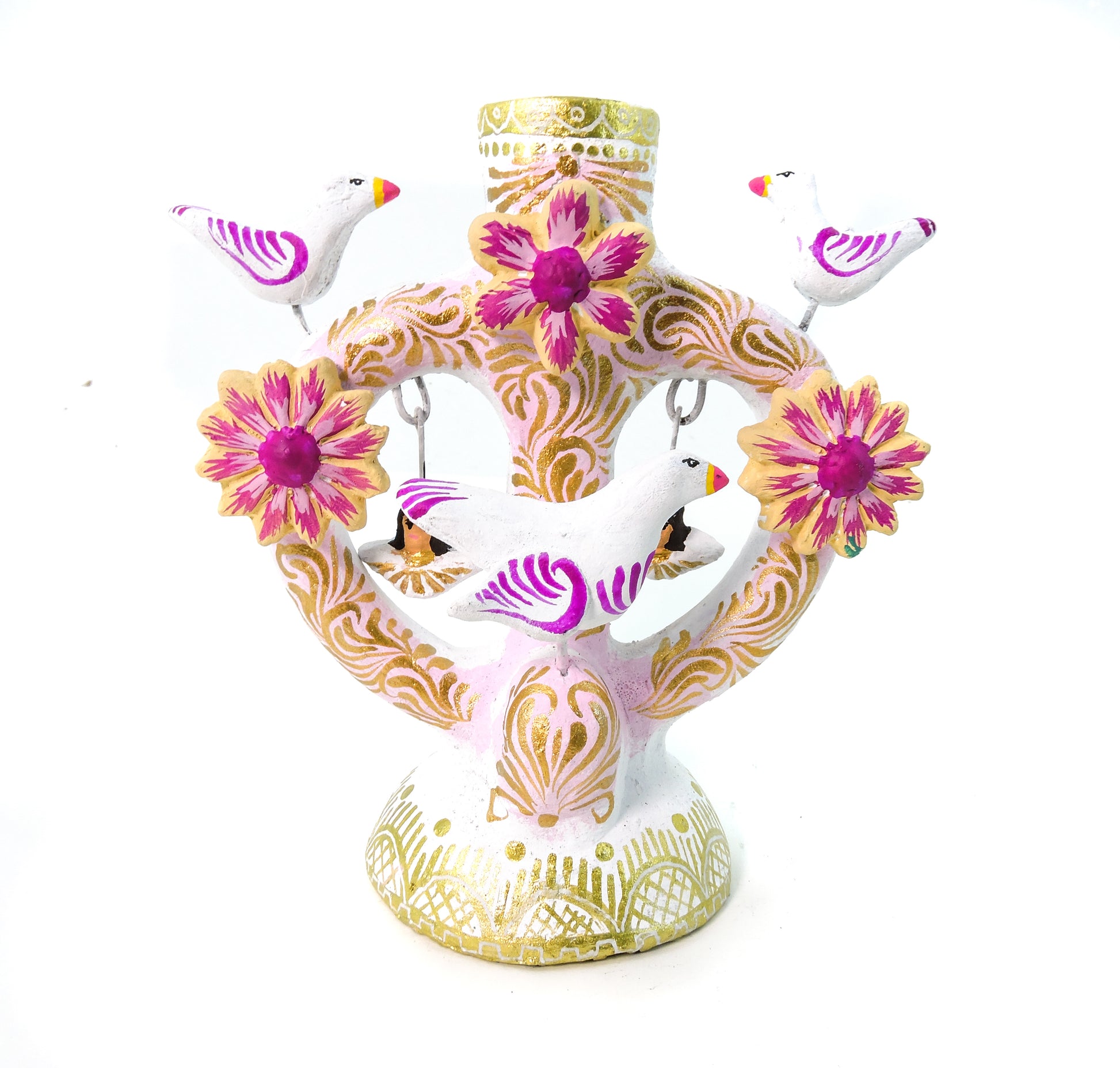 Hermosa artesanía, elaborada en el estado de Metepec, pintada por artesanos del estado de México, para elaborar este tipo de trabajo a mano se realizan los brazos, asi como el soporte para la vela y varias piezas, algunas otras son elaboradas con molde en la técnica de pastillaje, la elaboración de este tipo de piezas lleva un proceso de 1 a 2 meses, la pintura se realiza a mano con pintura acrílica de alta calidad para evitar el deterioro de la pieza, un producto hermoso totalmente artesanal que resalta en cualquier espacio de tu hogar