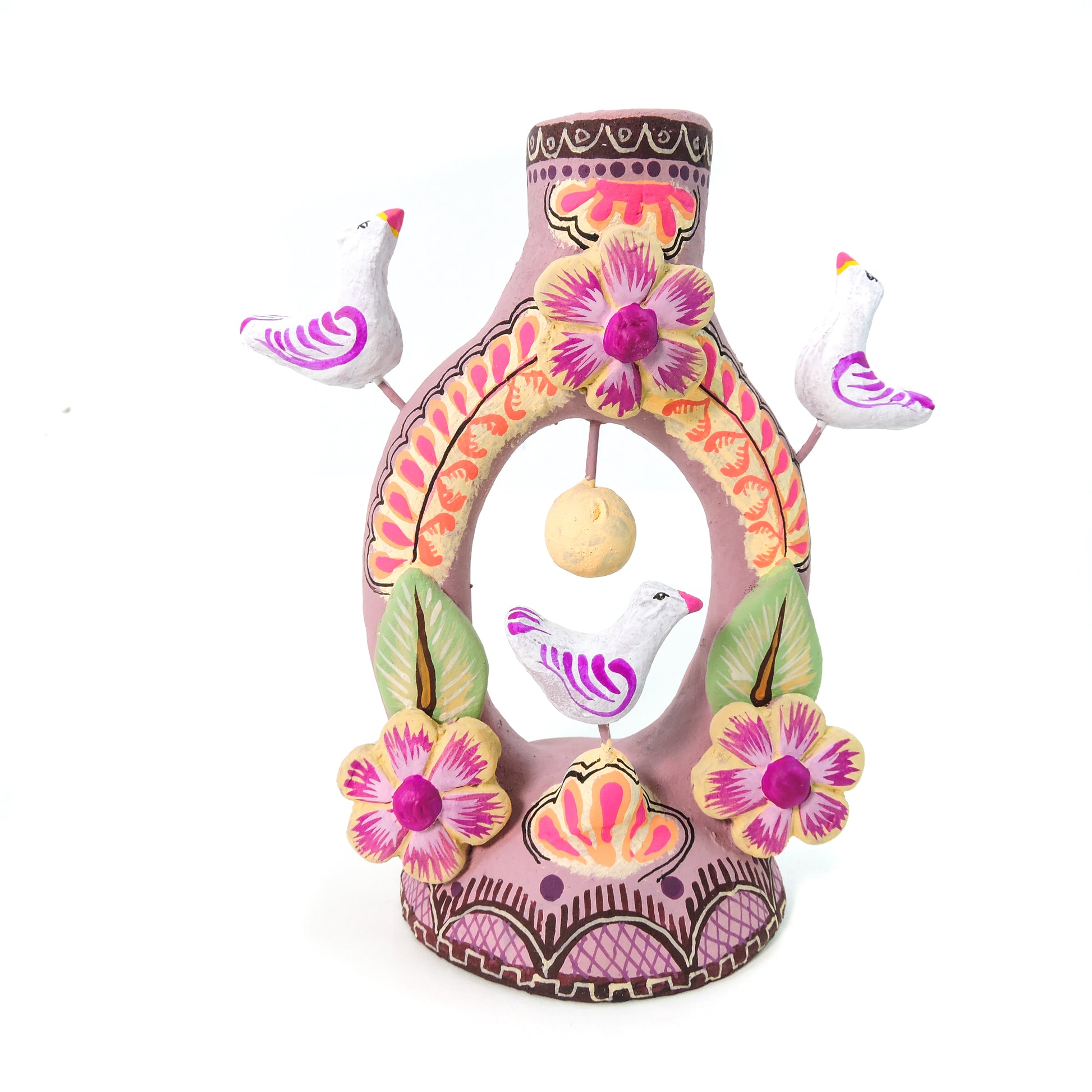 Hermosa artesanía, elaborada en el estado de Metepec, pintada por artesanos del estado de México, para elaborar este tipo de trabajo a mano se realizan los brazos, asi como el soporte para la vela y varias piezas, algunas otras son elaboradas con molde en la técnica de pastillaje, la elaboración de este tipo de piezas lleva un proceso de 1 a 2 meses, la pintura se realiza a mano con pintura acrílica de alta calidad para evitar el deterioro de la pieza, un producto hermoso totalmente artesanal que resalta en cualquier espacio de tu hogar
