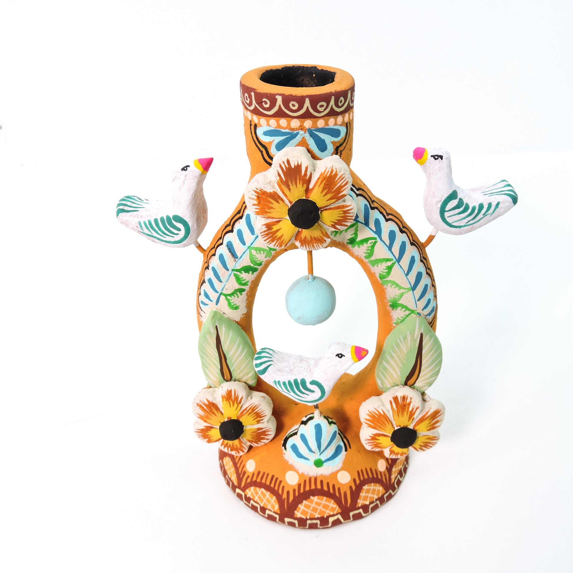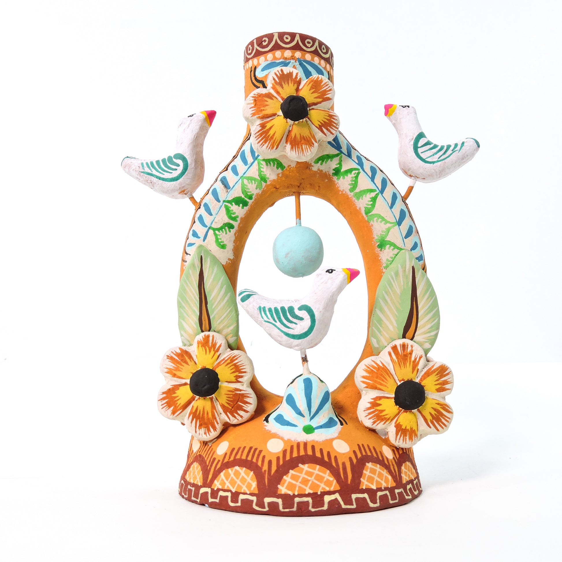 Hermosa artesanía, elaborada en el estado de Metepec, pintada por artesanos del estado de México, para elaborar este tipo de trabajo a mano se realizan los brazos, asi como el soporte para la vela y varias piezas, algunas otras son elaboradas con molde en la técnica de pastillaje, la elaboración de este tipo de piezas lleva un proceso de 1 a 2 meses, la pintura se realiza a mano con pintura acrílica de alta calidad para evitar el deterioro de la pieza, un producto hermoso totalmente artesanal que resalta en cualquier espacio de tu hogar