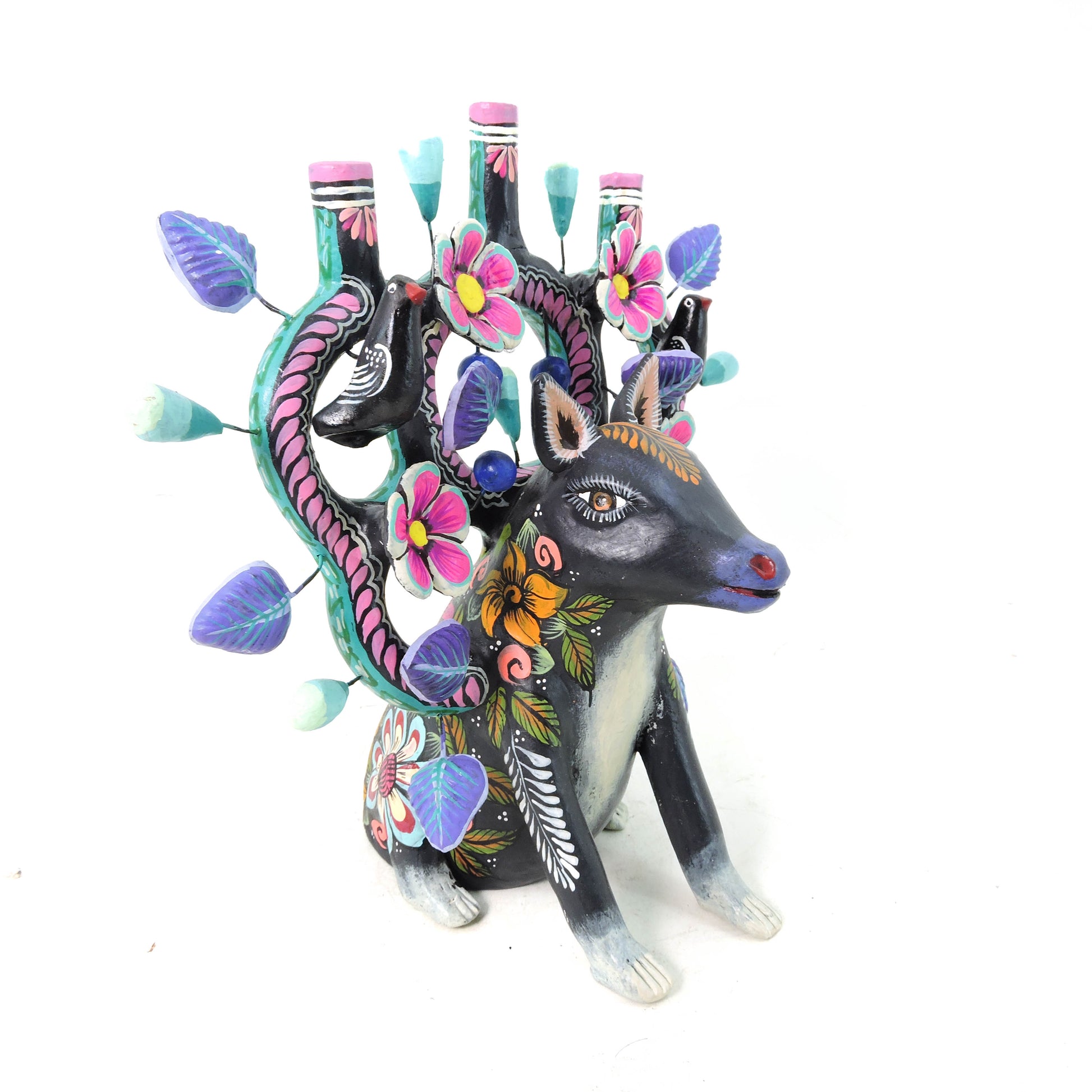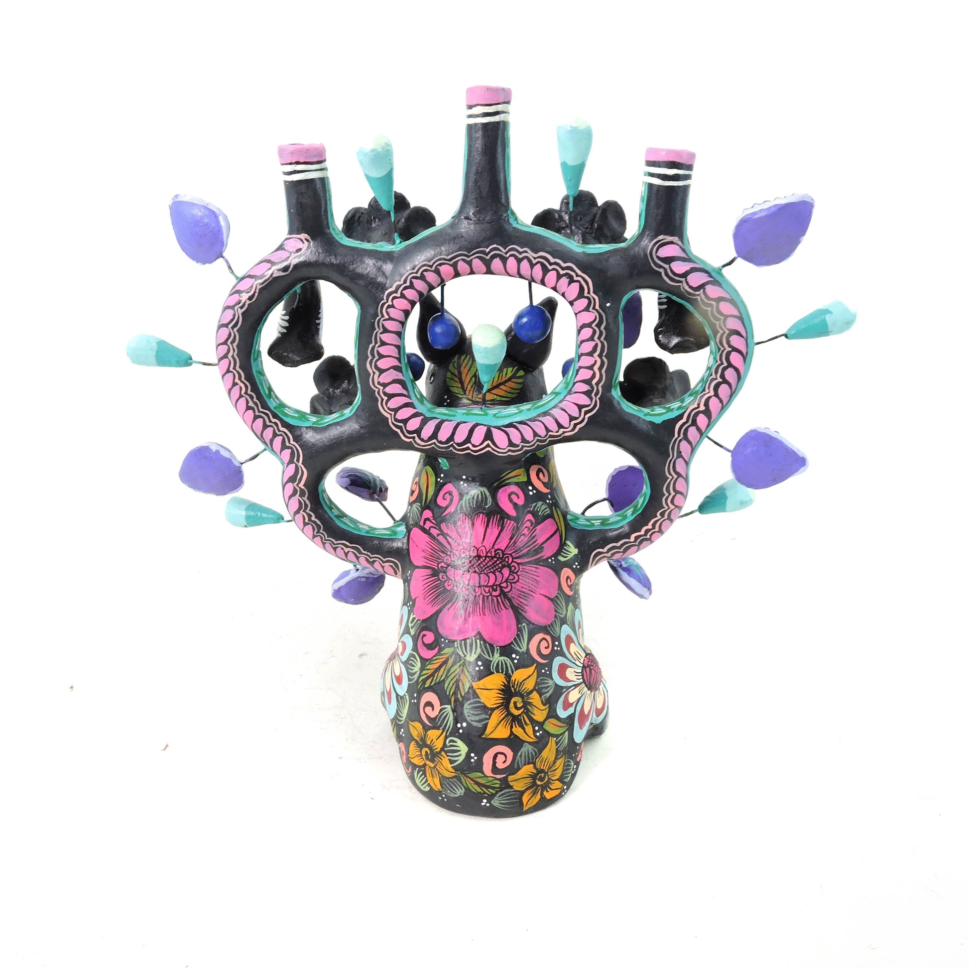 Hermosa artesanía, elaborada en el estado de Metepec, pintada por artesanos del estado de México, para elaborar este tipo de trabajo a mano se realizan los brazos, asi como el soporte para la vela y varias piezas, algunas otras son elaboradas con molde en la técnica de pastillaje, la elaboración de este tipo de piezas lleva un proceso de 1 a 2 meses, la pintura se realiza a mano con pintura acrílica de alta calidad para evitar el deterioro de la pieza, un producto hermoso totalmente artesanal que resalta en cualquier espacio de tu hogar
