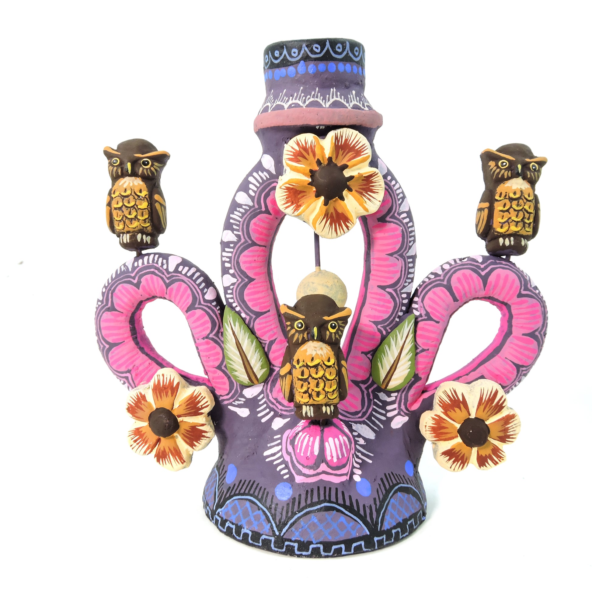 Hermosa artesanía, elaborada en el estado de Metepec, pintada por artesanos del estado de México, para elaborar este tipo de trabajo a mano se realizan los brazos, asi como el soporte para la vela y varias piezas, algunas otras son elaboradas con molde en la técnica de pastillaje, la elaboración de este tipo de piezas lleva un proceso de 1 a 2 meses, la pintura se realiza a mano con pintura acrílica de alta calidad para evitar el deterioro de la pieza, un producto hermoso totalmente artesanal que resalta en cualquier espacio de tu hogar