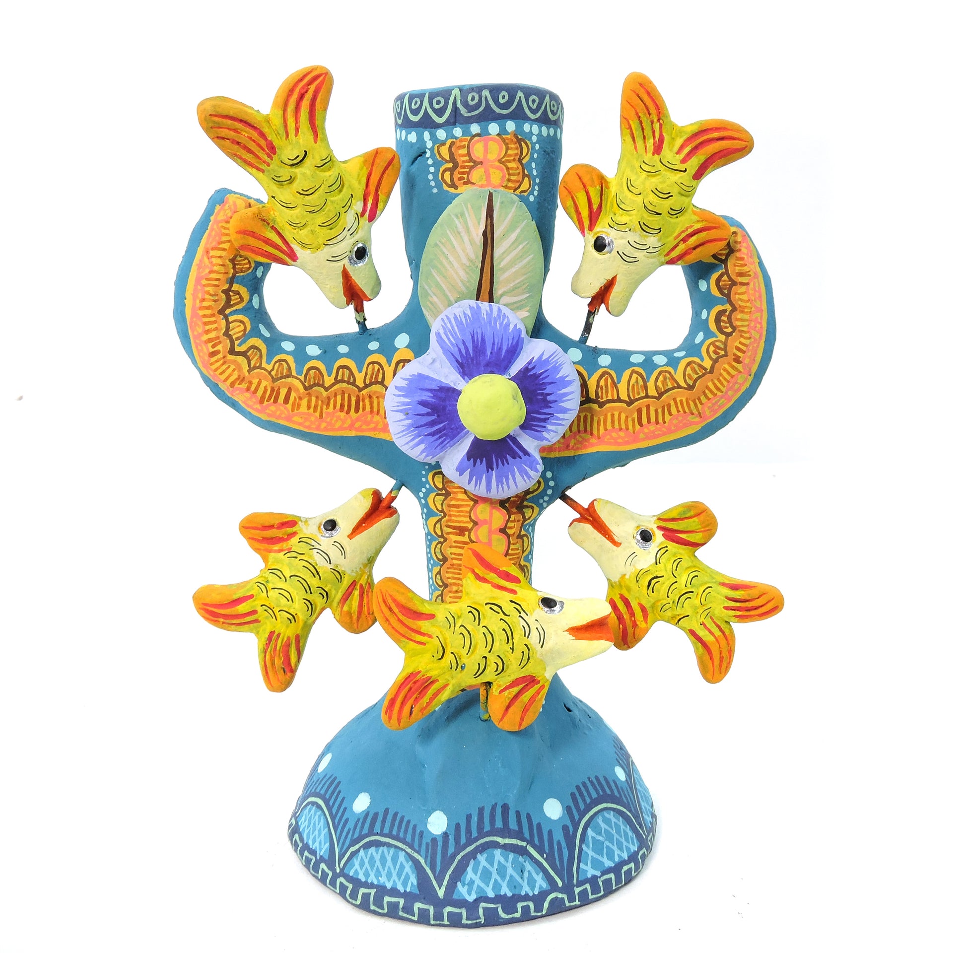 Hermosa artesanía, elaborada en el estado de Metepec, pintada por artesanos del estado de México, para elaborar este tipo de trabajo a mano se realizan los brazos, asi como el soporte para la vela y varias piezas, algunas otras son elaboradas con molde en la técnica de pastillaje, la elaboración de este tipo de piezas lleva un proceso de 1 a 2 meses, la pintura se realiza a mano con pintura acrílica de alta calidad para evitar el deterioro de la pieza, un producto hermoso totalmente artesanal que resalta en cualquier espacio de tu hogar