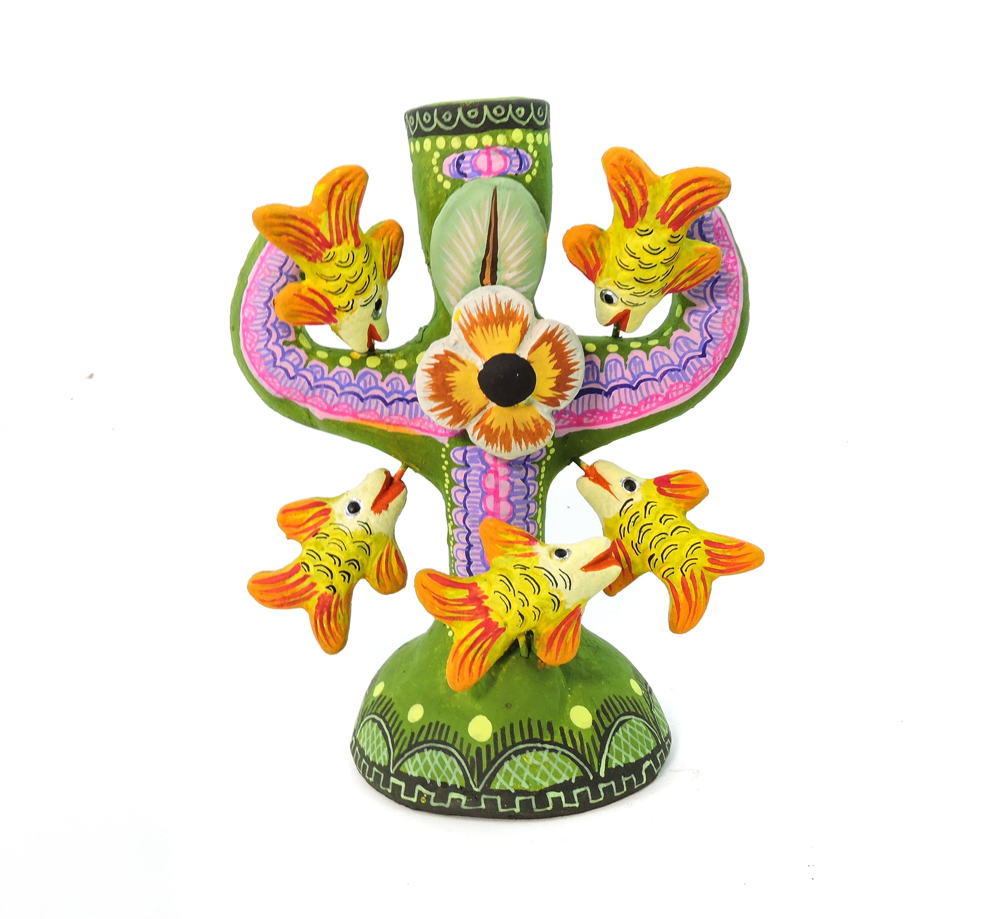 Hermosa artesanía, elaborada en el estado de Metepec, pintada por artesanos del estado de México, para elaborar este tipo de trabajo a mano se realizan los brazos, asi como el soporte para la vela y varias piezas, algunas otras son elaboradas con molde en la técnica de pastillaje, la elaboración de este tipo de piezas lleva un proceso de 1 a 2 meses, la pintura se realiza a mano con pintura acrílica de alta calidad para evitar el deterioro de la pieza, un producto hermoso totalmente artesanal que resalta en cualquier espacio de tu hogar