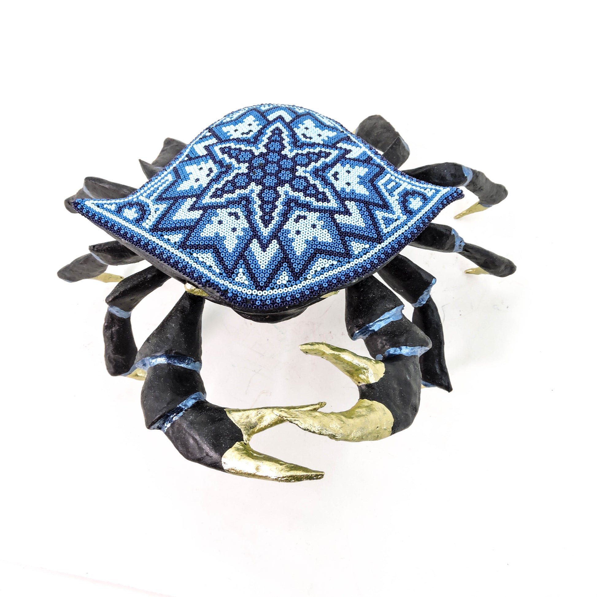 Cada pieza es una obra de talento y paciencia, pues cada una de las chaquiras es pegada a mano, para formar los patrones de la cosmogonia wixarika.