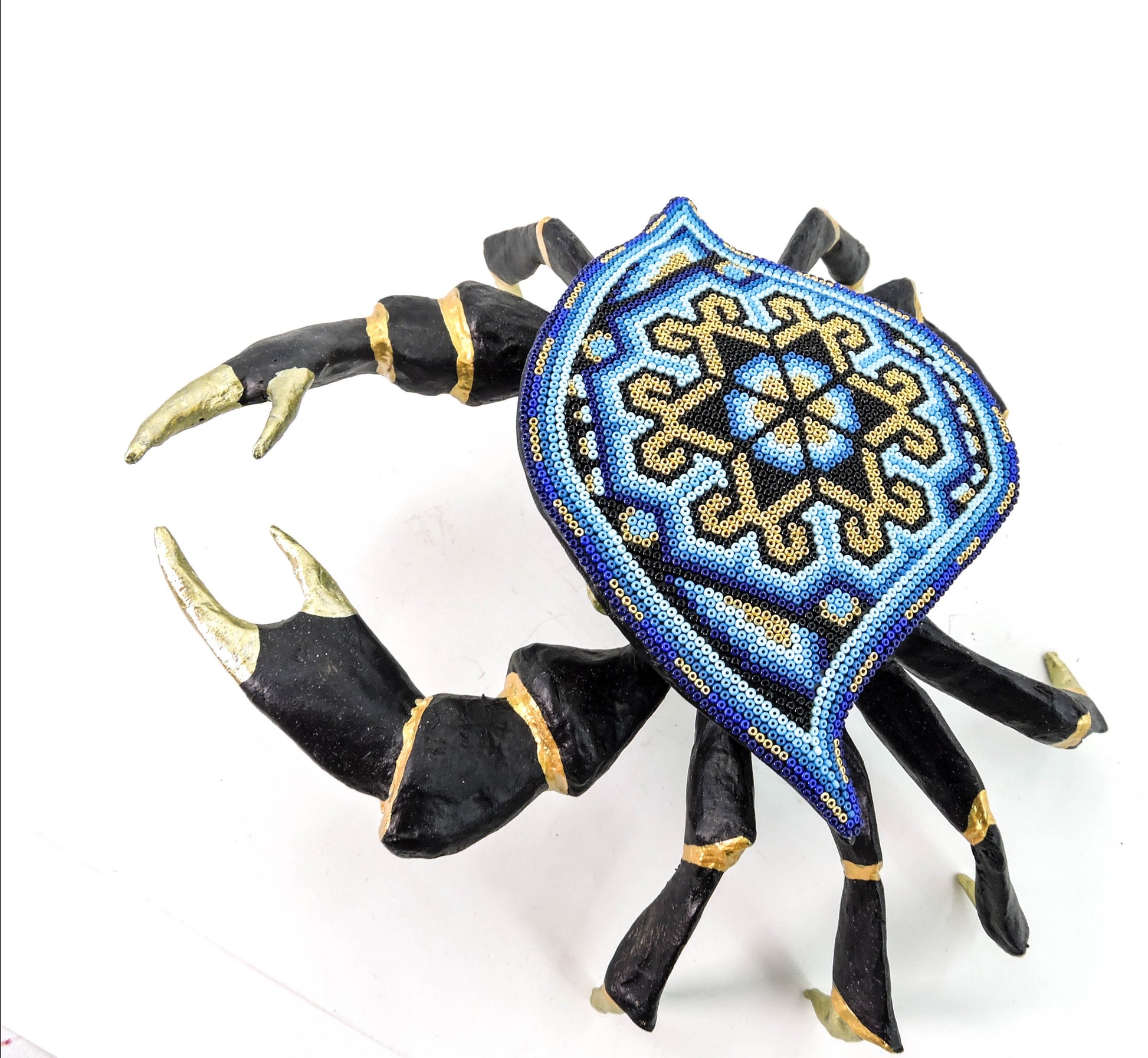 Cada pieza es una obra de talento y paciencia, pues cada una de las chaquiras es pegada a mano, para formar los patrones de la cosmogonia wixarika.