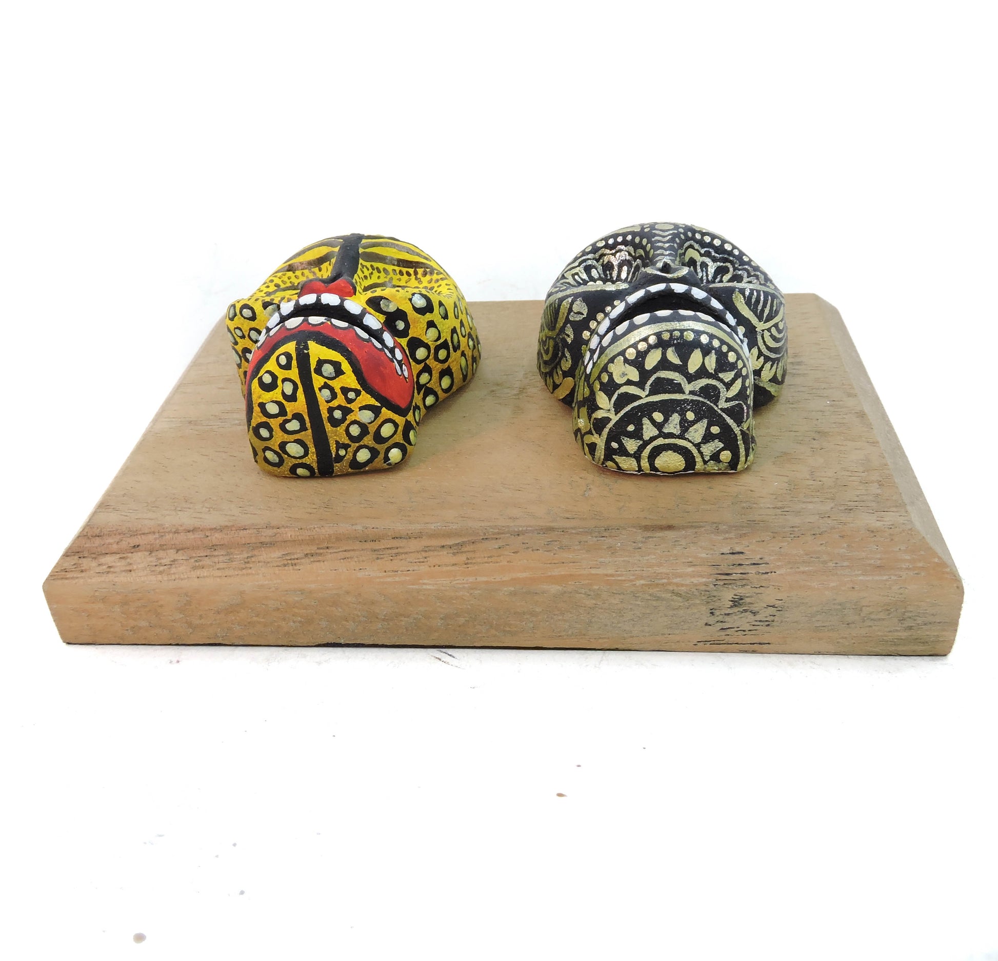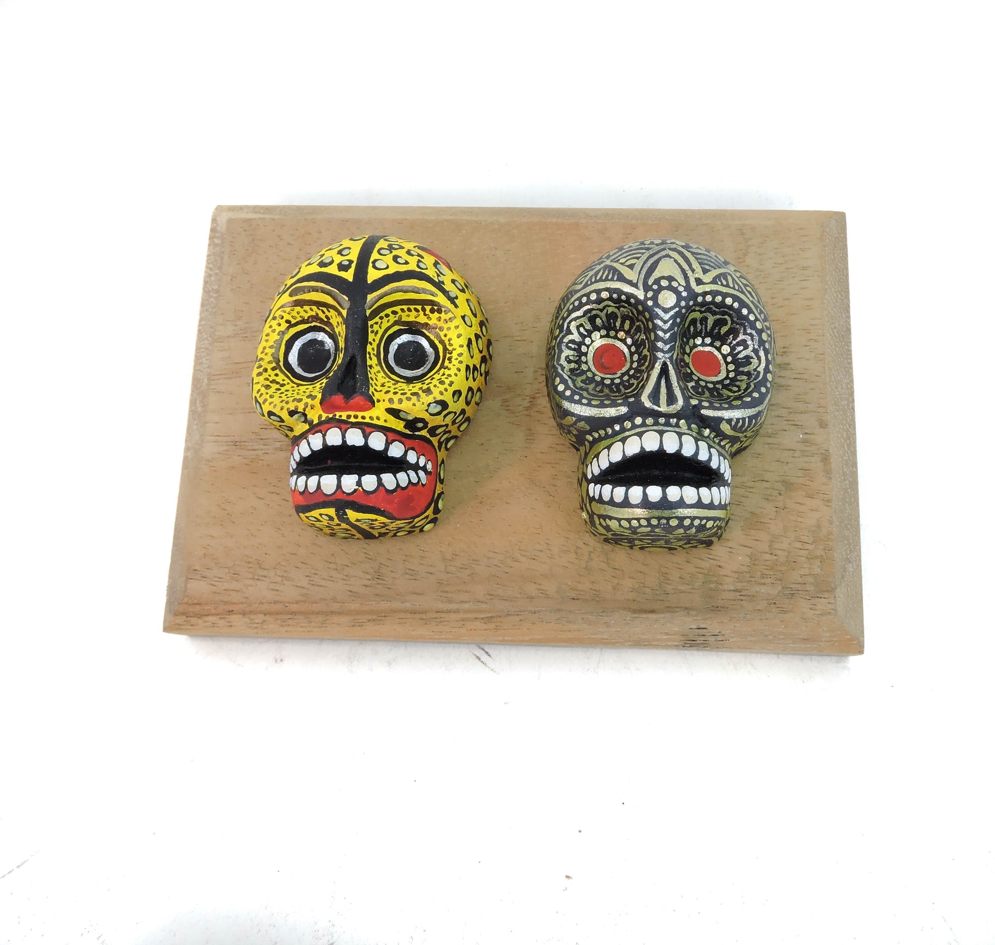 Hermosas calaveras elaboradas a mano en barro de alta temperatura, cada pieza fue pintada a mano con un estilo unico y especial, cada cuadro tiene unas medidas aproximadas, de 15x10 cm, cuentan con una base de madera fina, cada pieza puede colgarse de manera individual en la pared al gusto, lleva a tu hogar una pieza unica y llena de color
