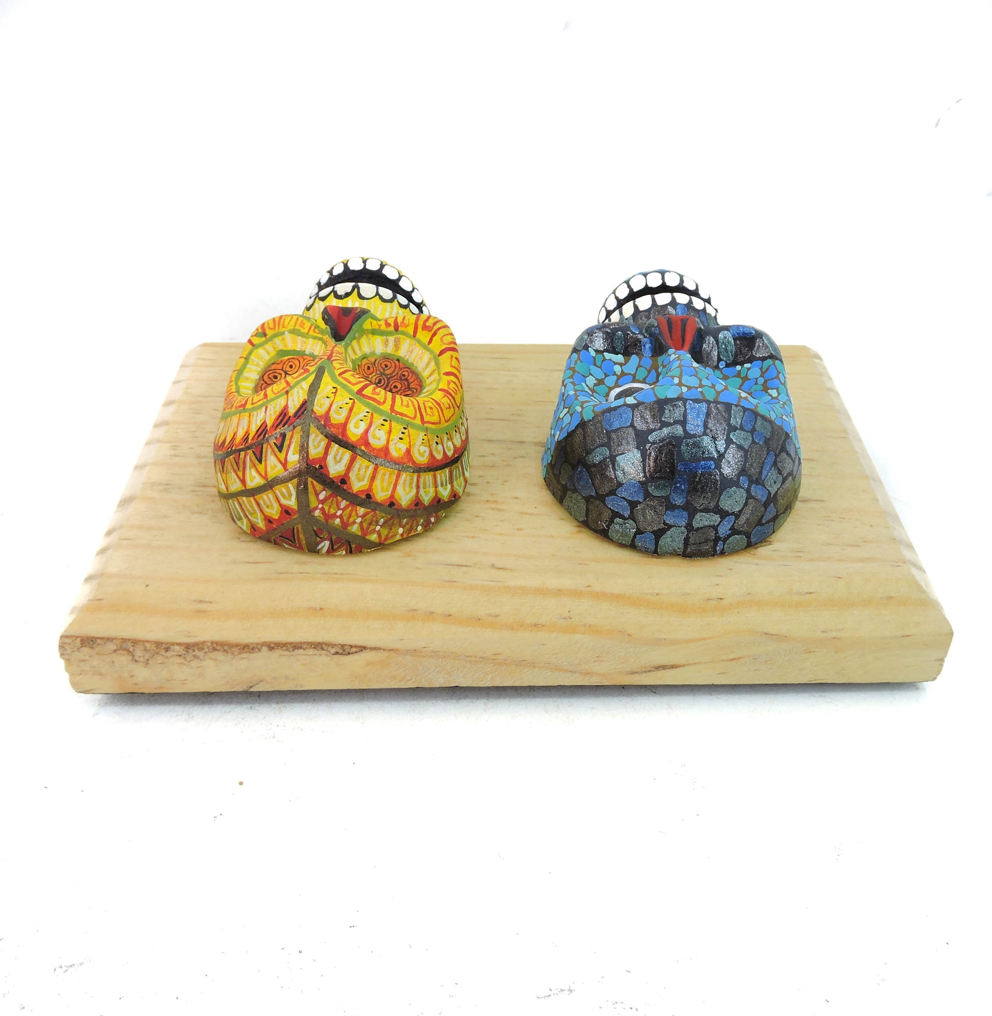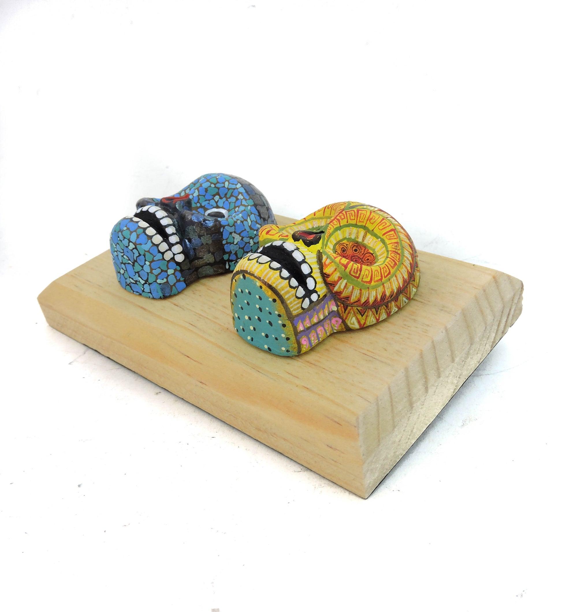 Hermosas calaveras elaboradas a mano en barro de alta temperatura, cada pieza fue pintada a mano con un estilo unico y especial, cada cuadro tiene unas medidas aproximadas, de 15x10 cm, cuentan con una base de madera fina, cada pieza puede colgarse de manera individual en la pared al gusto, lleva a tu hogar una pieza unica y llena de color
