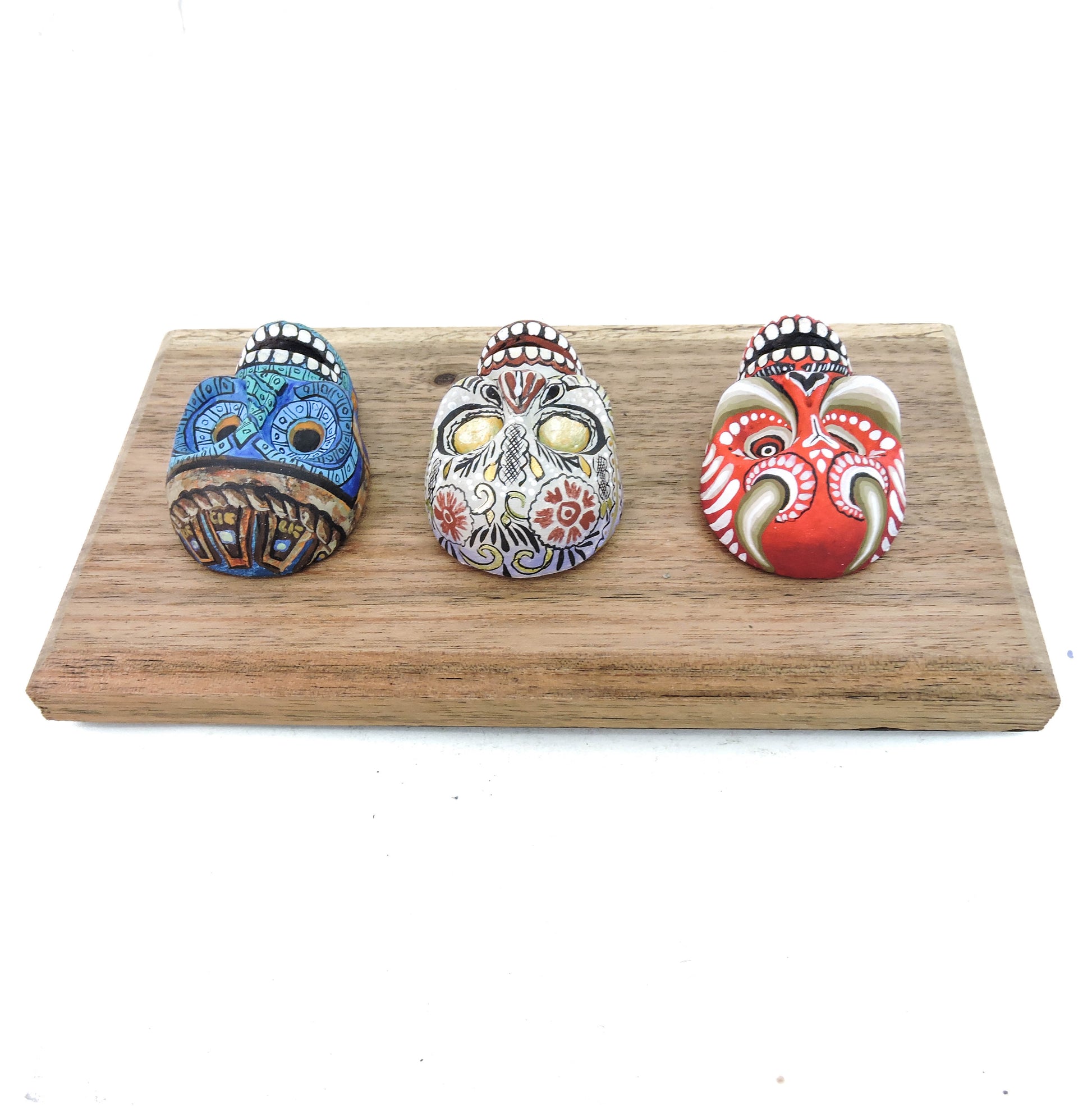 Hermosas calaveras elaboradas a mano en barro de alta temperatura, cada pieza fue pintada a mano con un estilo unico y especial, cada cuadro tiene unas medidas aproximadas, de 15x10 cm, cuentan con una base de madera fina, cada pieza puede colgarse de manera individual en la pared al gusto, lleva a tu hogar una pieza unica y llena de color