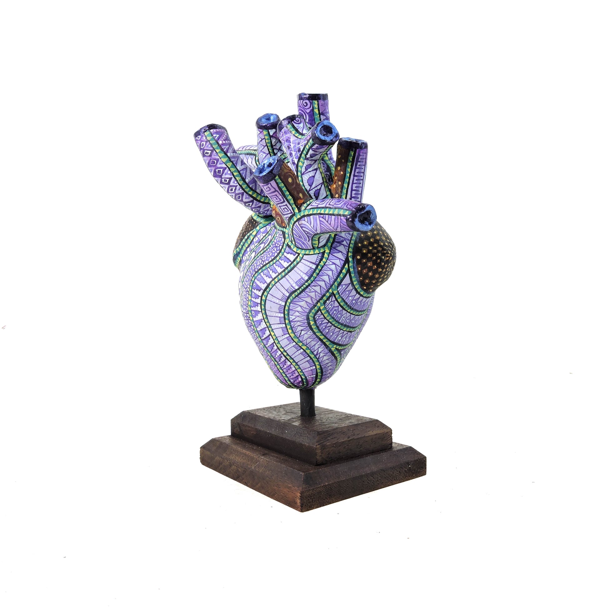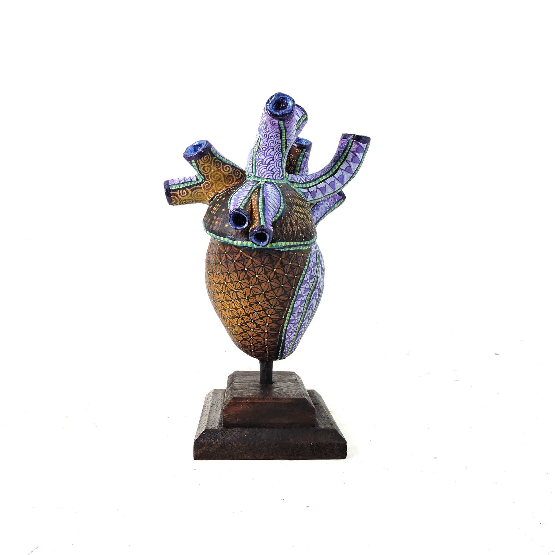 Presentamos nuestra nueva colección inspirada en la pintura oaxaqueña, elaborada en cartonería y pintada a mano con patrones geométricos y colores vibrantes. La pieza fusiona un corazón anatómico con un cráneo, evocando la dualidad entre la vida y la muerte. Sus arterias se extienden como raíces, mientras el rostro recuerda el arte zapoteco con su precisión en los detalles. Con dimensiones aproximadas de 25 x 20 x 12 cm, se presenta sobre una base de madera, dando un carácter ceremonial y simbólico a esta obra única.