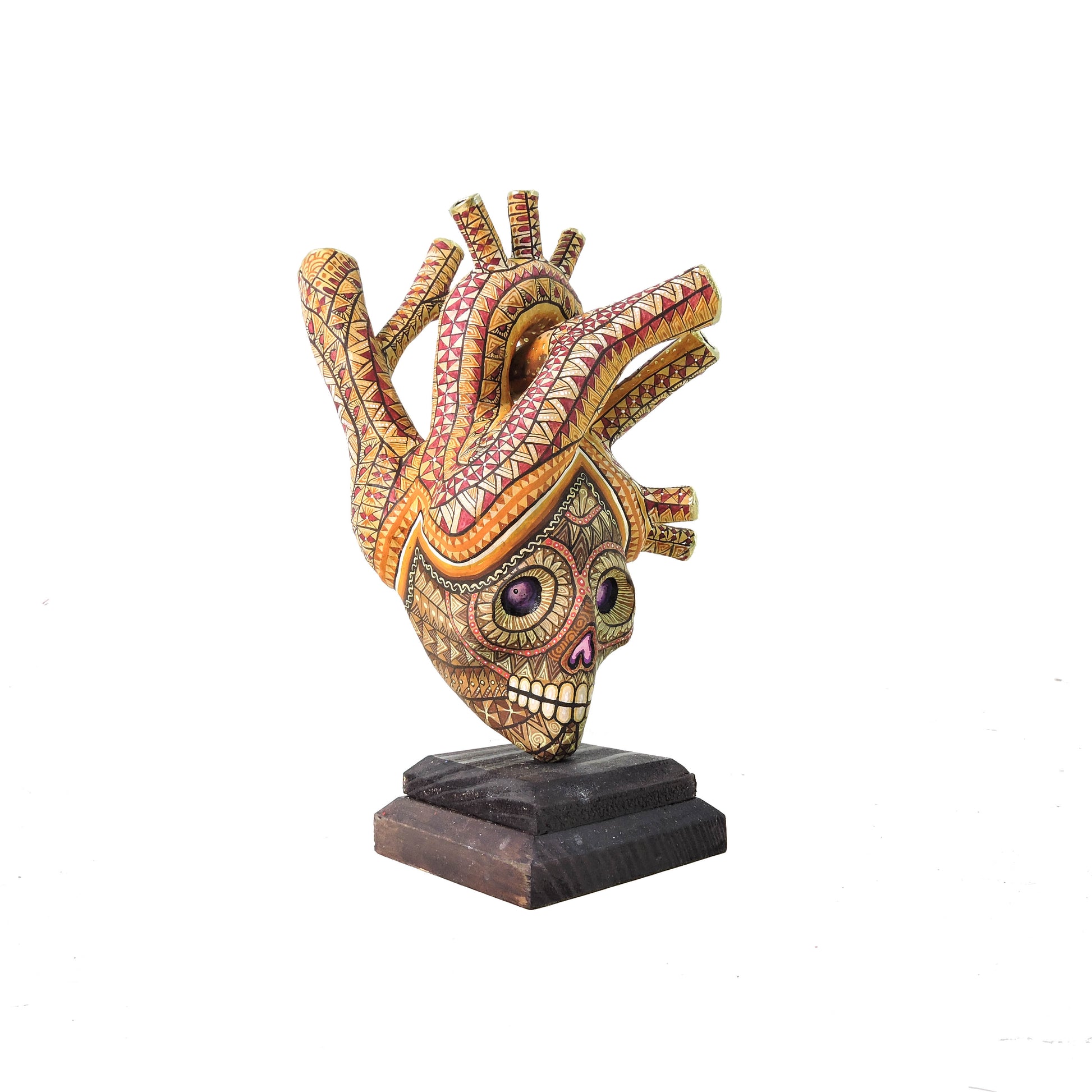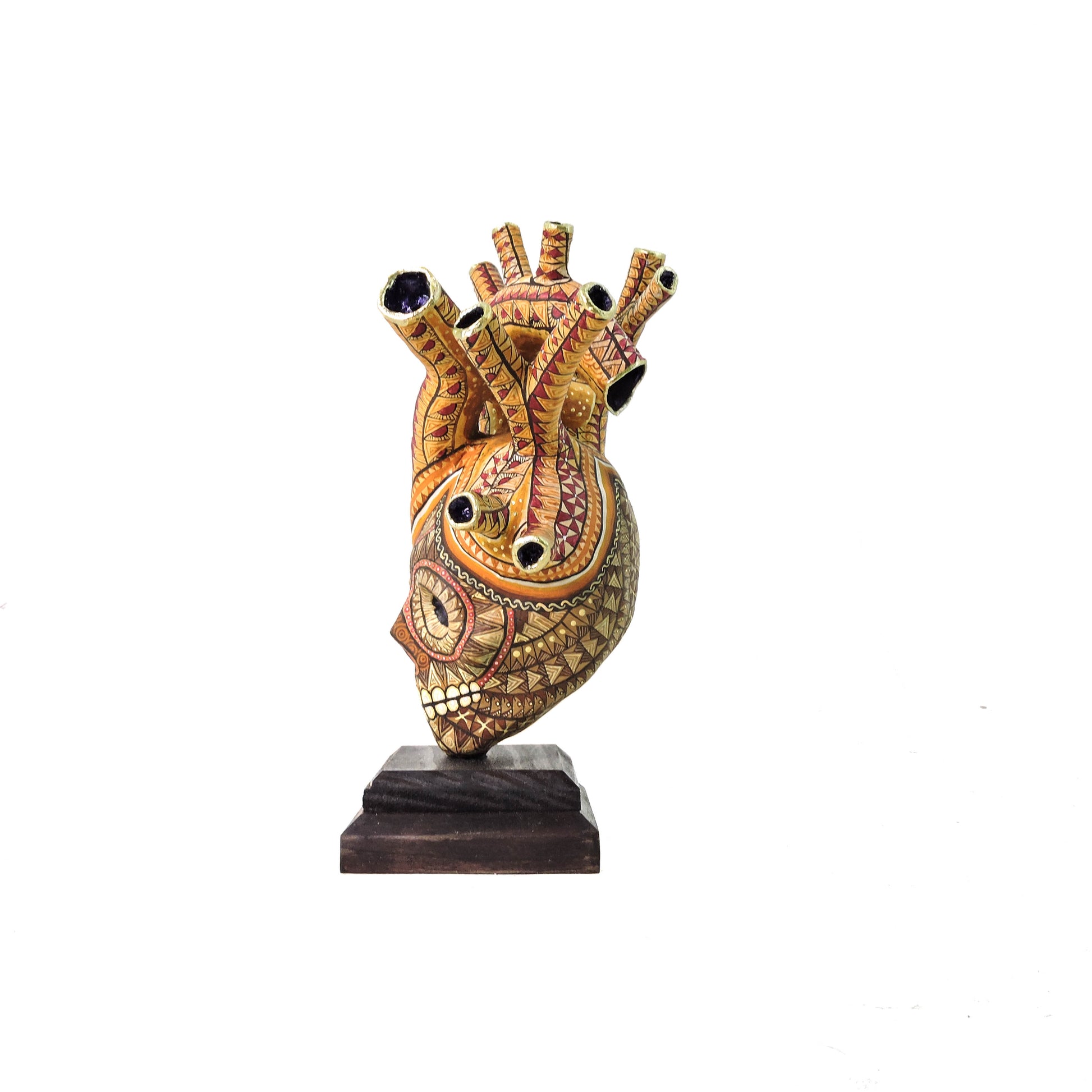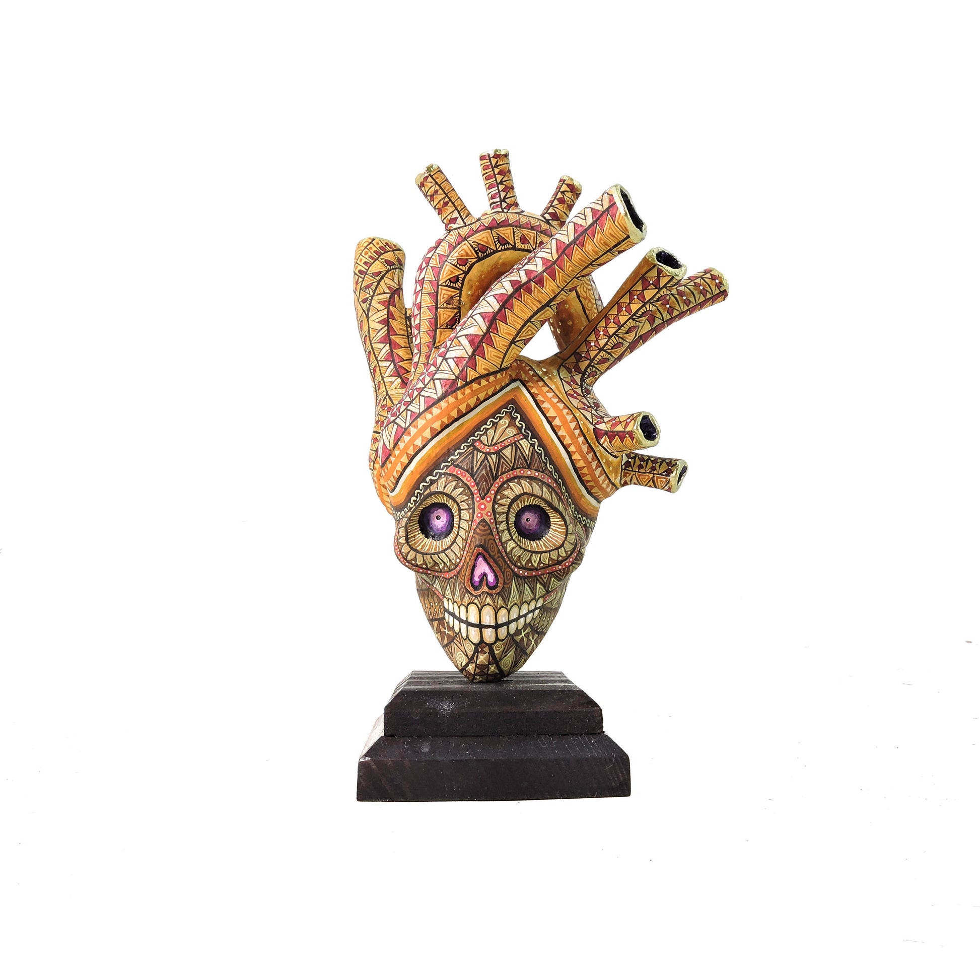 Presentamos nuestra nueva colección inspirada en la pintura oaxaqueña, elaborada en cartonería y pintada a mano con patrones geométricos y colores vibrantes. La pieza fusiona un corazón anatómico con un cráneo, evocando la dualidad entre la vida y la muerte. Sus arterias se extienden como raíces, mientras el rostro recuerda el arte zapoteco con su precisión en los detalles. Con dimensiones aproximadas de 25 x 20 x 12 cm, se presenta sobre una base de madera, dando un carácter ceremonial y simbólico a esta obra única.