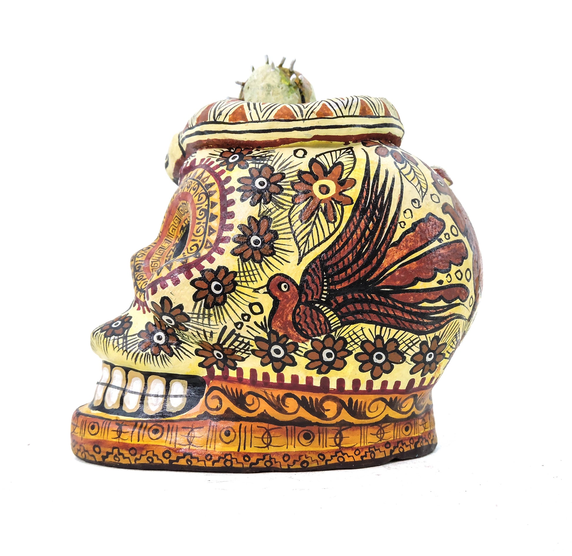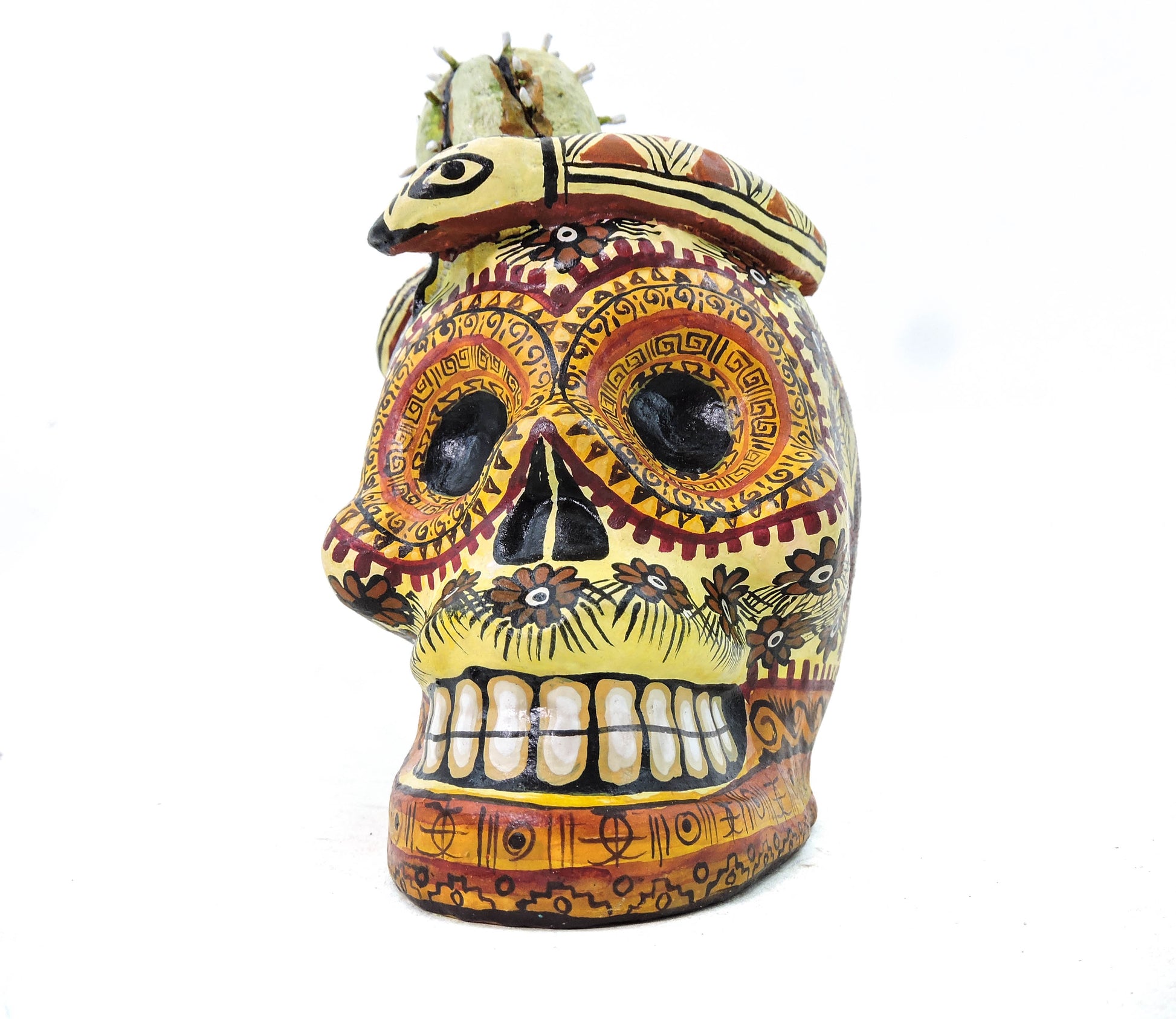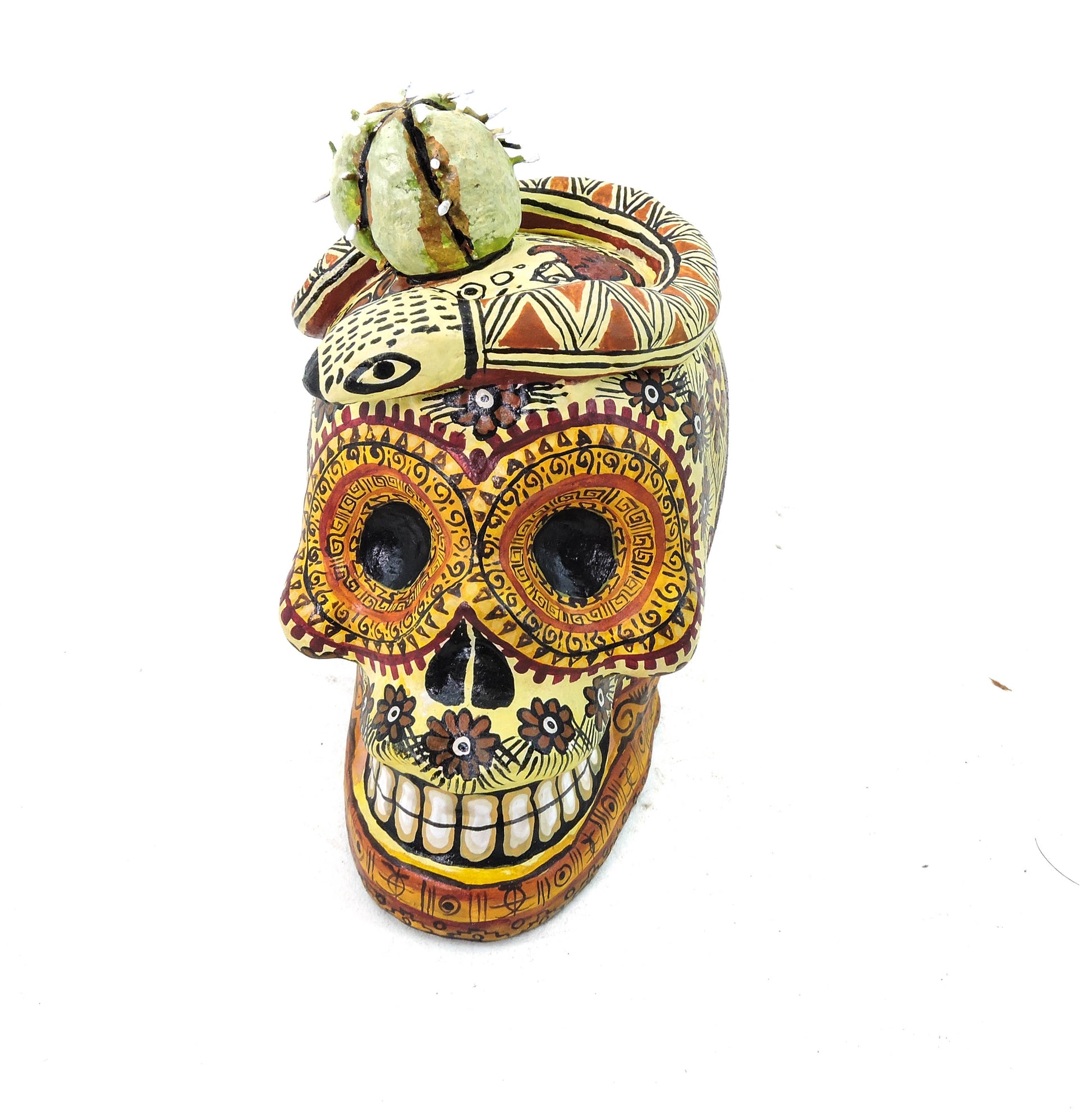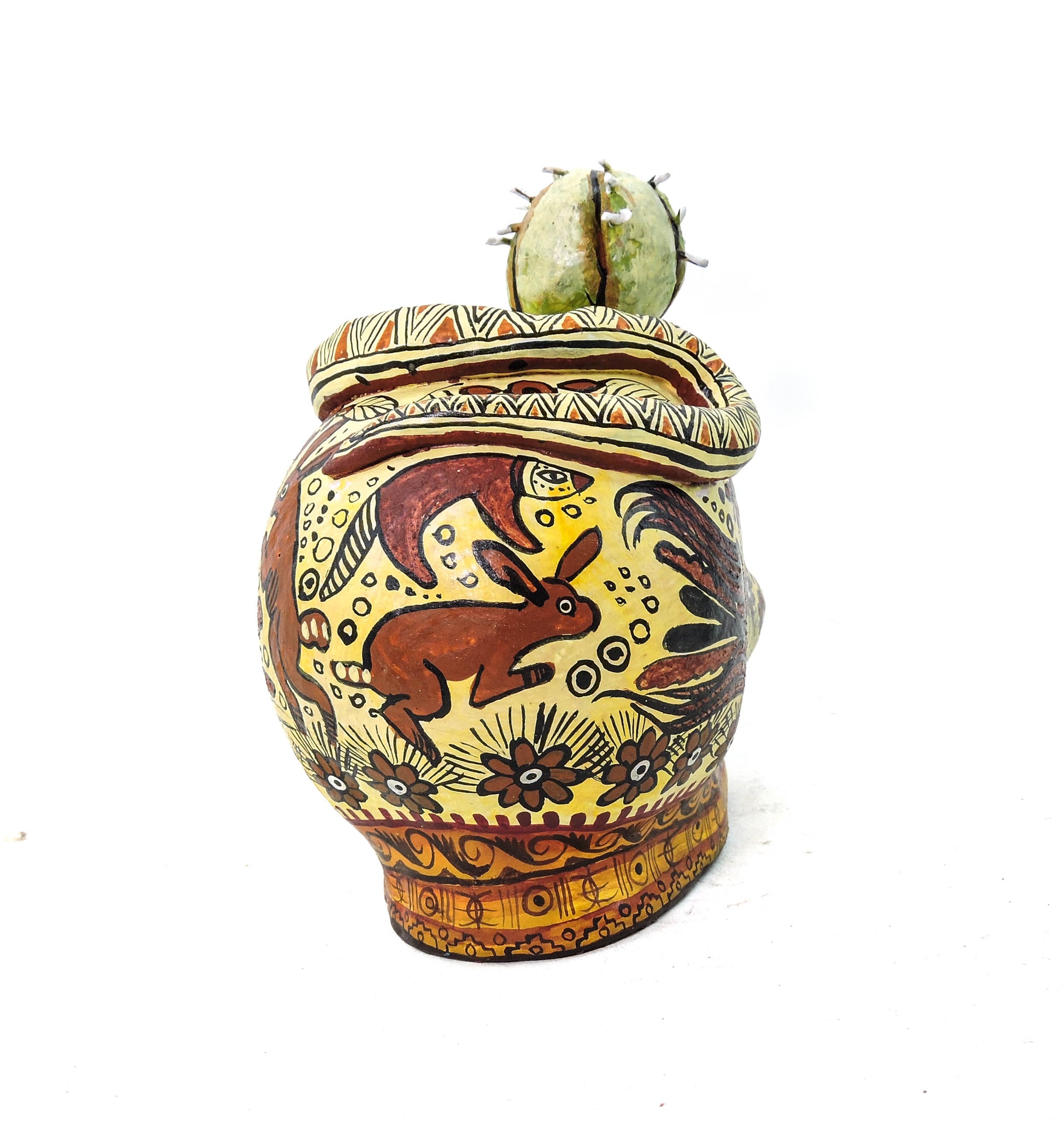Hermosa pieza de artesania, elaborada en barro de alta temperatura en el estado de Toluca, en Metepec, es una pieza con una clasica y elegante decoracion de cenefas inspirados en la cultura popular y la riqueza artesanal mexicana.