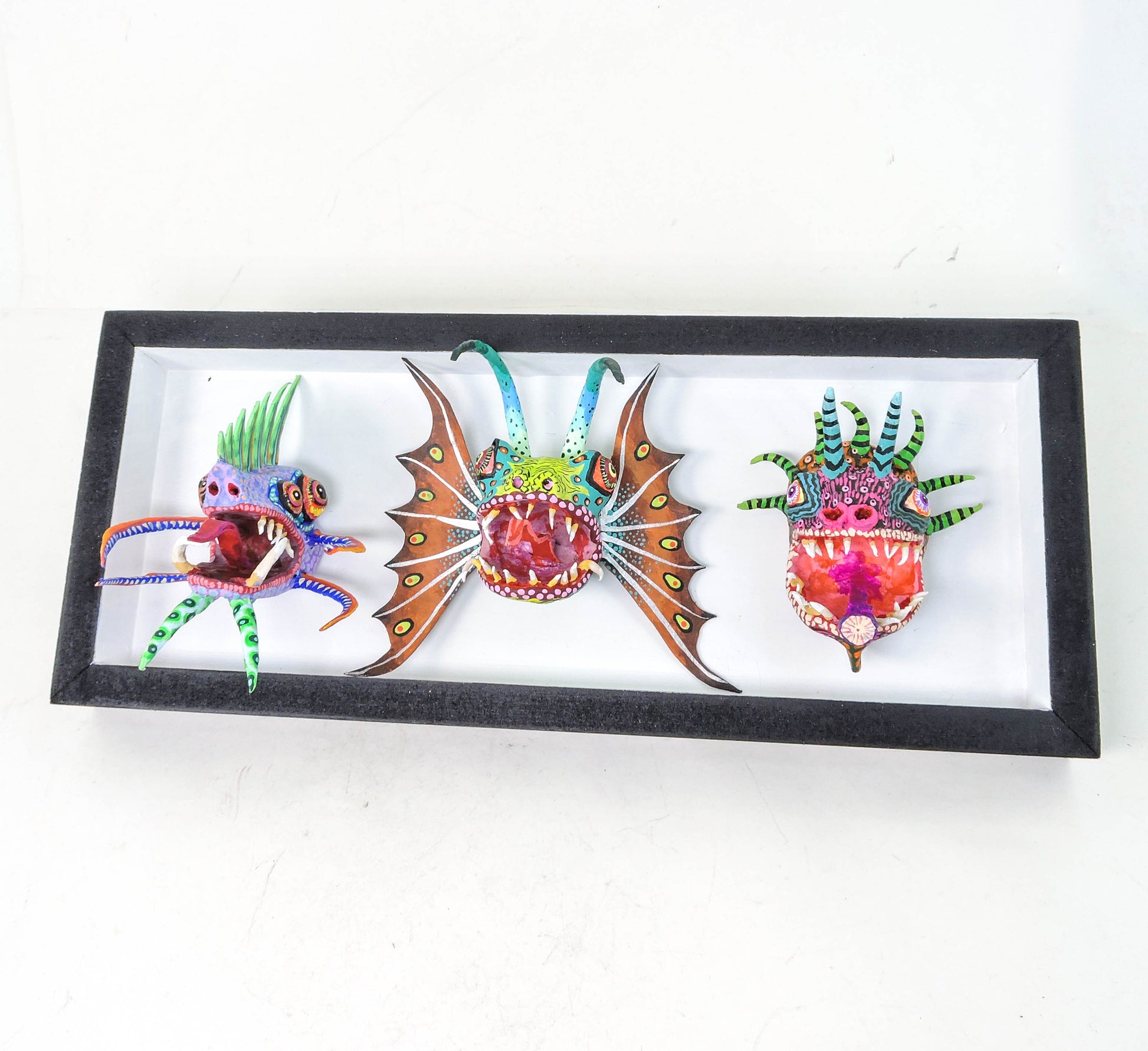 Este set de tres hermosas cabezas de alebrije, elaboradas totalmente a mano es una serie de esculturas, miniaturizadas, de alebrijes el taller Nahualcalli en esta ocasion decidimos concentrarnos en hacer estas piezas extremadamente detalladas para lograr captar la escencia de la piezas como si fueran cabezas grandes, este montaje, se realizo en la tecnica de la cartoneria, pintado y esculpido totalmente a mano