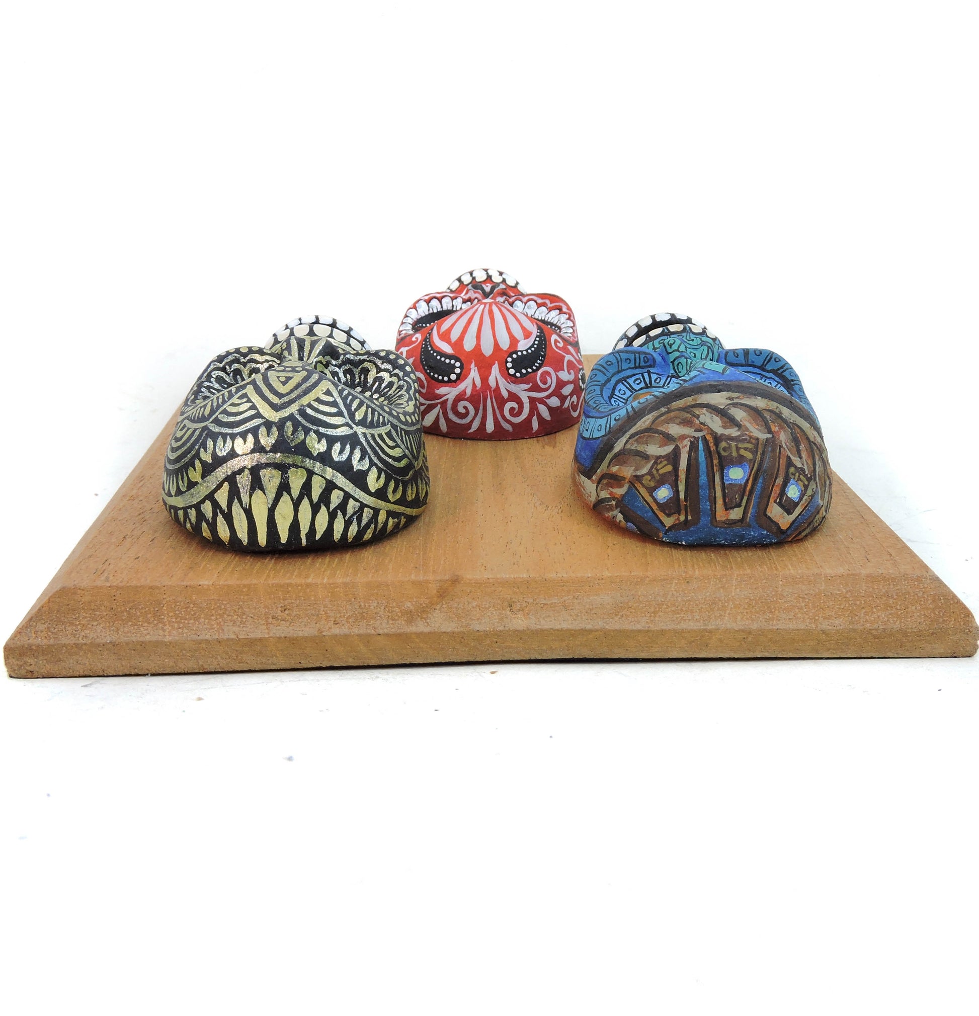 Hermosas calaveras elaboradas a mano en barro de alta temperatura, cada pieza fue pintada a mano con un estilo unico y especial, cada cuadro tiene unas medidas aproximadas, de 18x18 cm, cuentan con una base de madera fina, cada pieza puede colgarse de manera individual en la pared al gusto, lleva a tu hogar una pieza unica y llena de color
