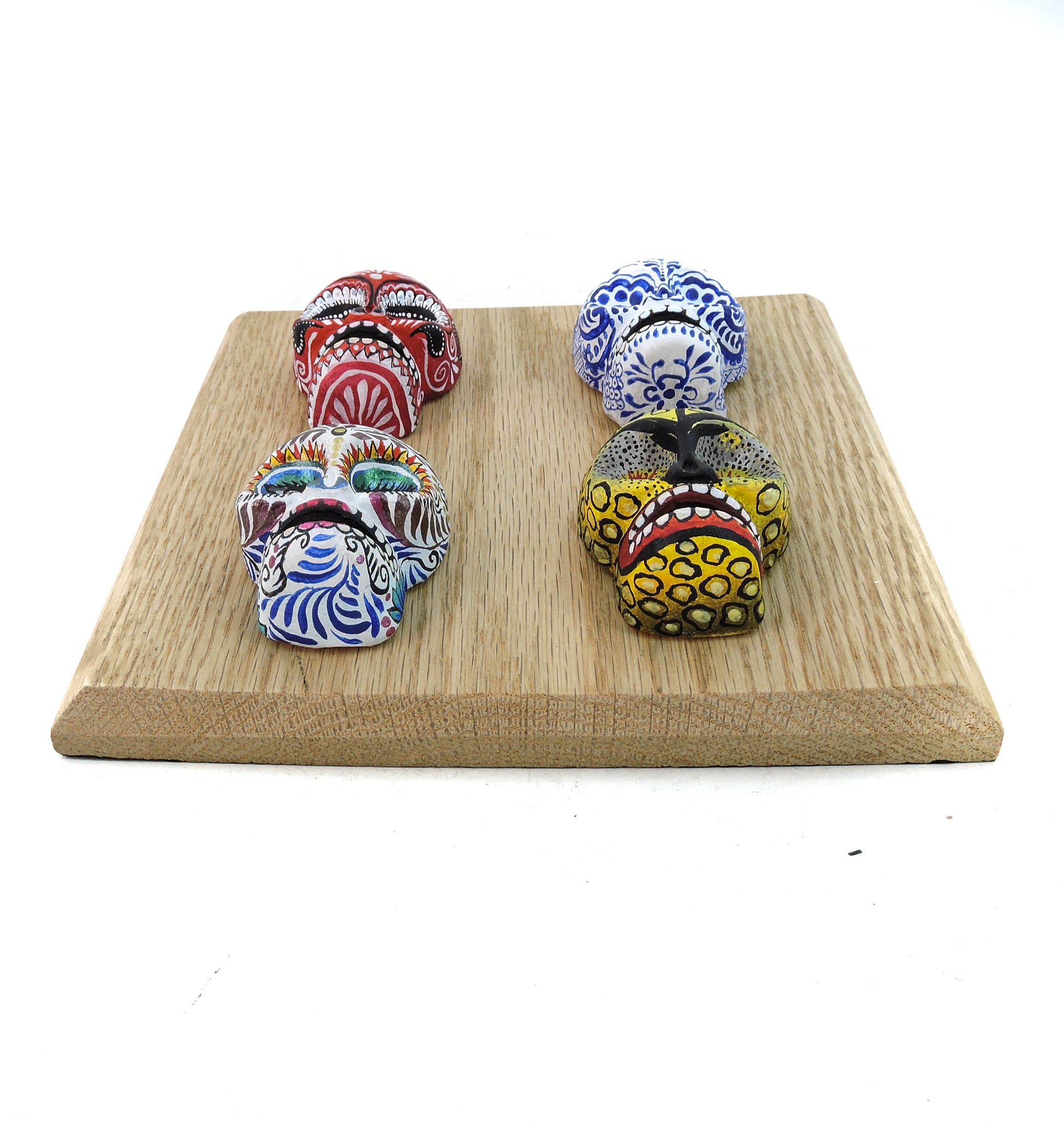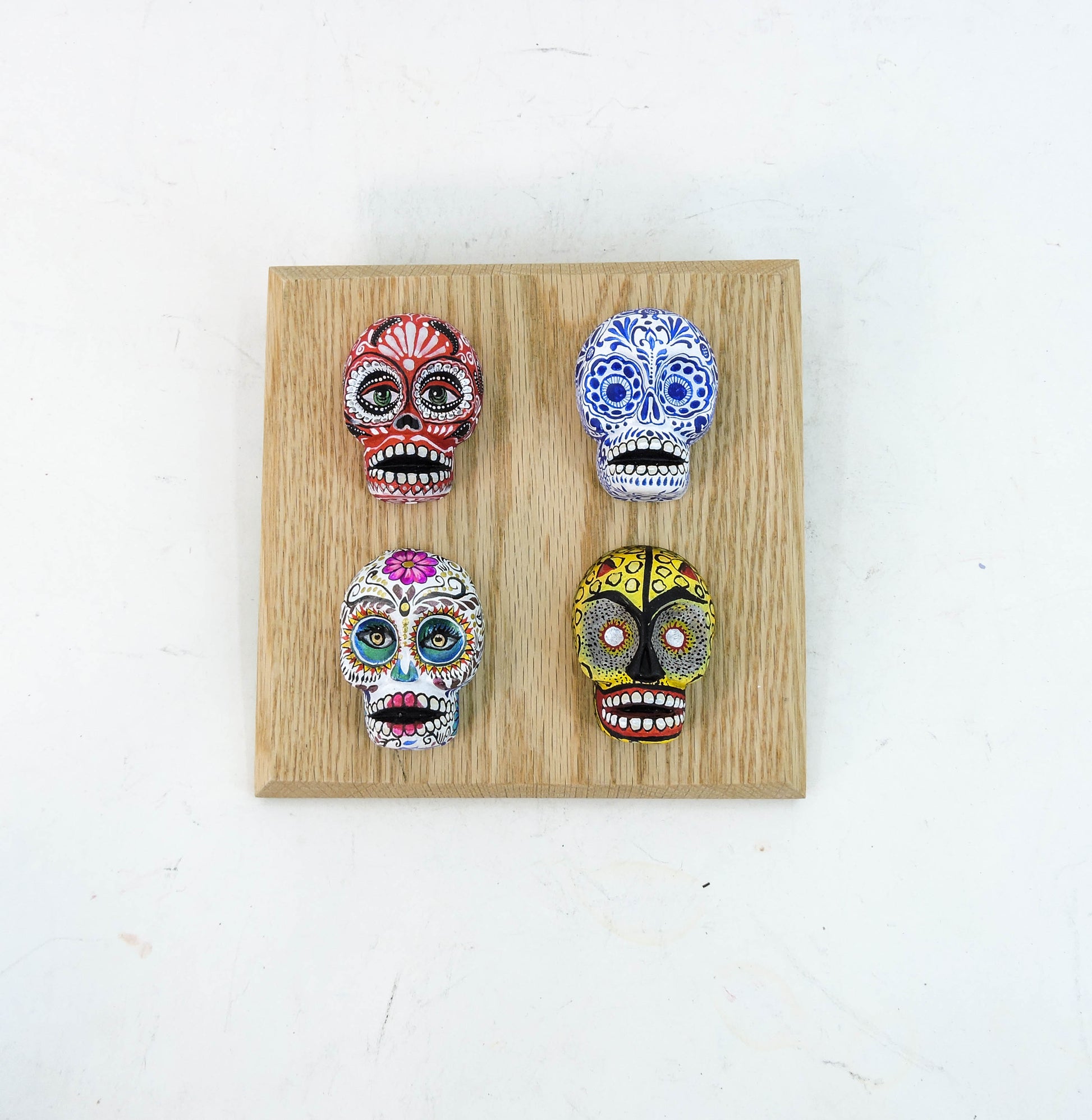 Hermosas calaveras elaboradas a mano en barro de alta temperatura, cada pieza fue pintada a mano con un estilo unico y especial, cada cuadro tiene unas medidas aproximadas, de cm, cuentan con una base de madera fina, cada pieza puede colgarse de manera individual en la pared al gusto, lleva a tu hogar una pieza unica y llena de color