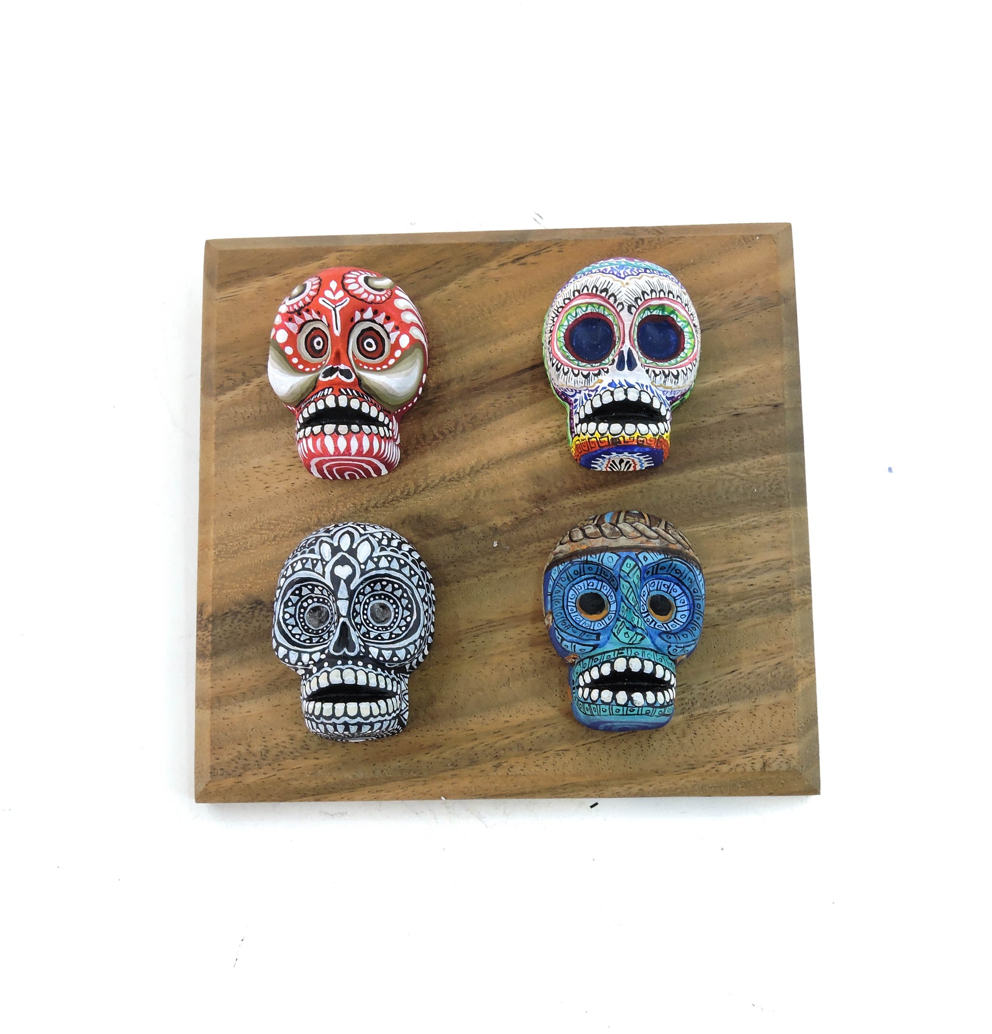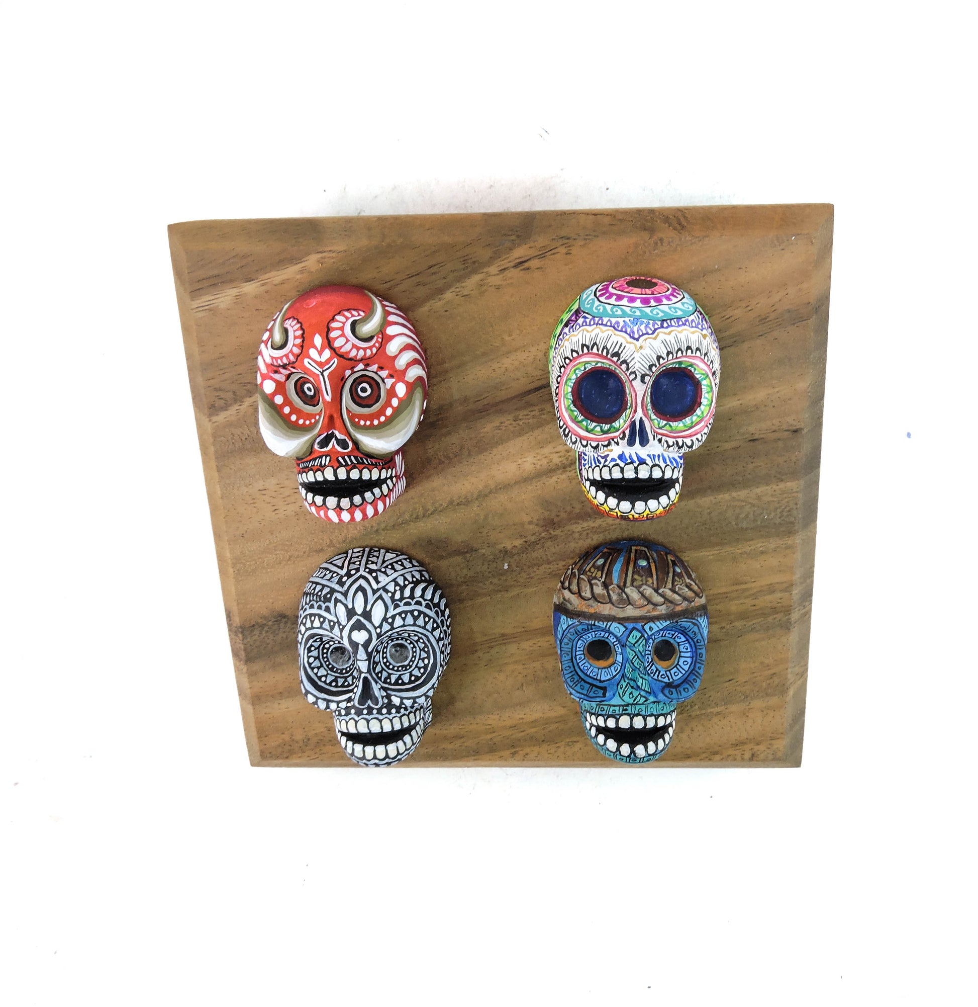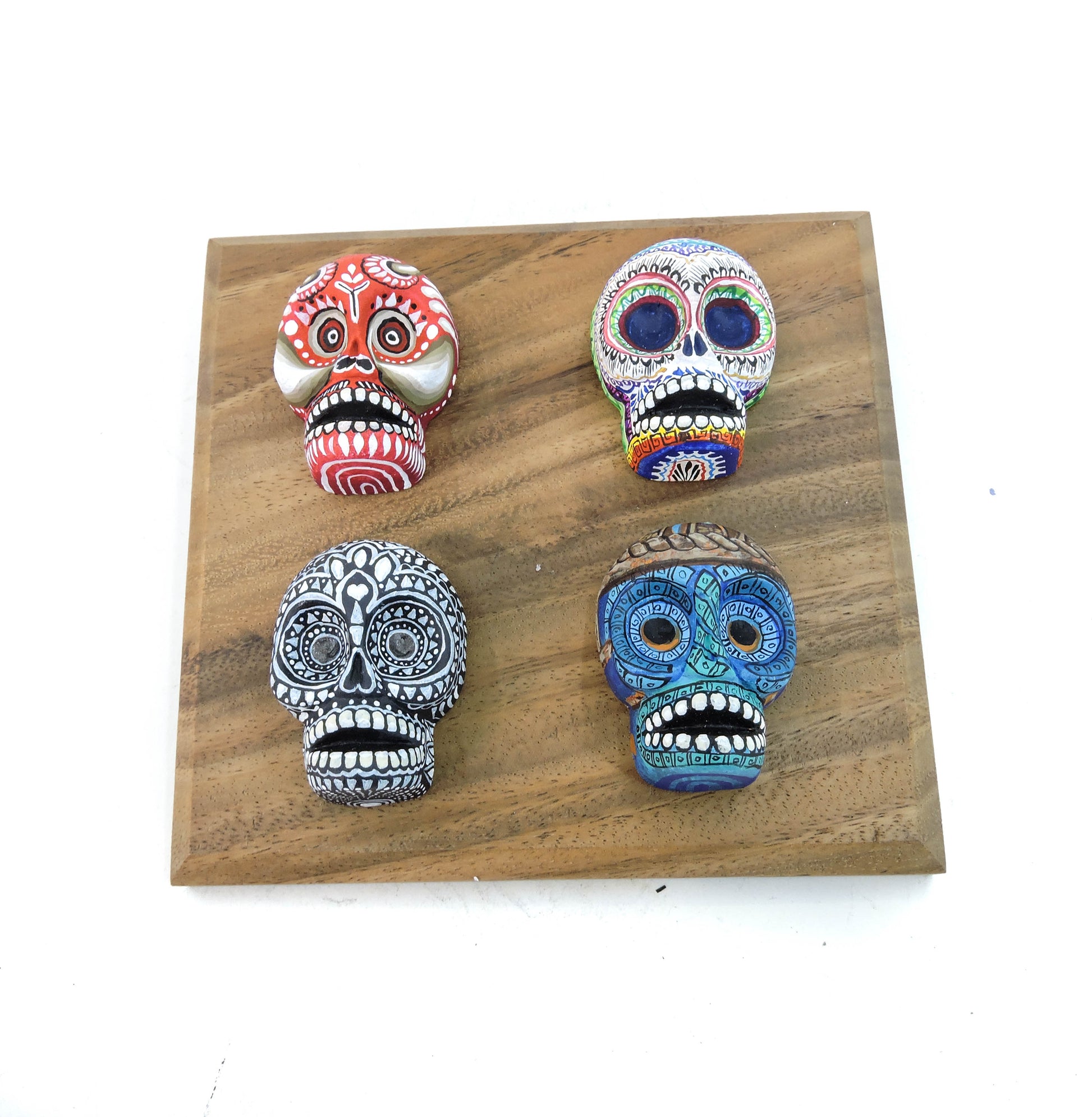 Hermosas calaveras elaboradas a mano en barro de alta temperatura, cada pieza fue pintada a mano con un estilo unico y especial, cada cuadro tiene unas medidas aproximadas, de 18x18 cm, cuentan con una base de madera fina, cada pieza puede colgarse de manera individual en la pared al gusto, lleva a tu hogar una pieza unica y llena de color