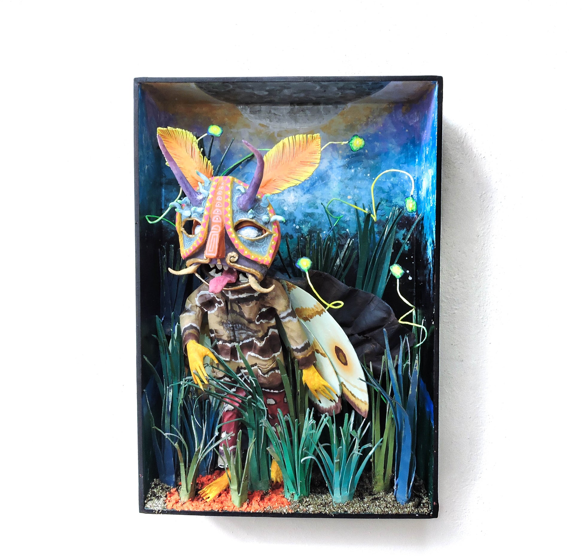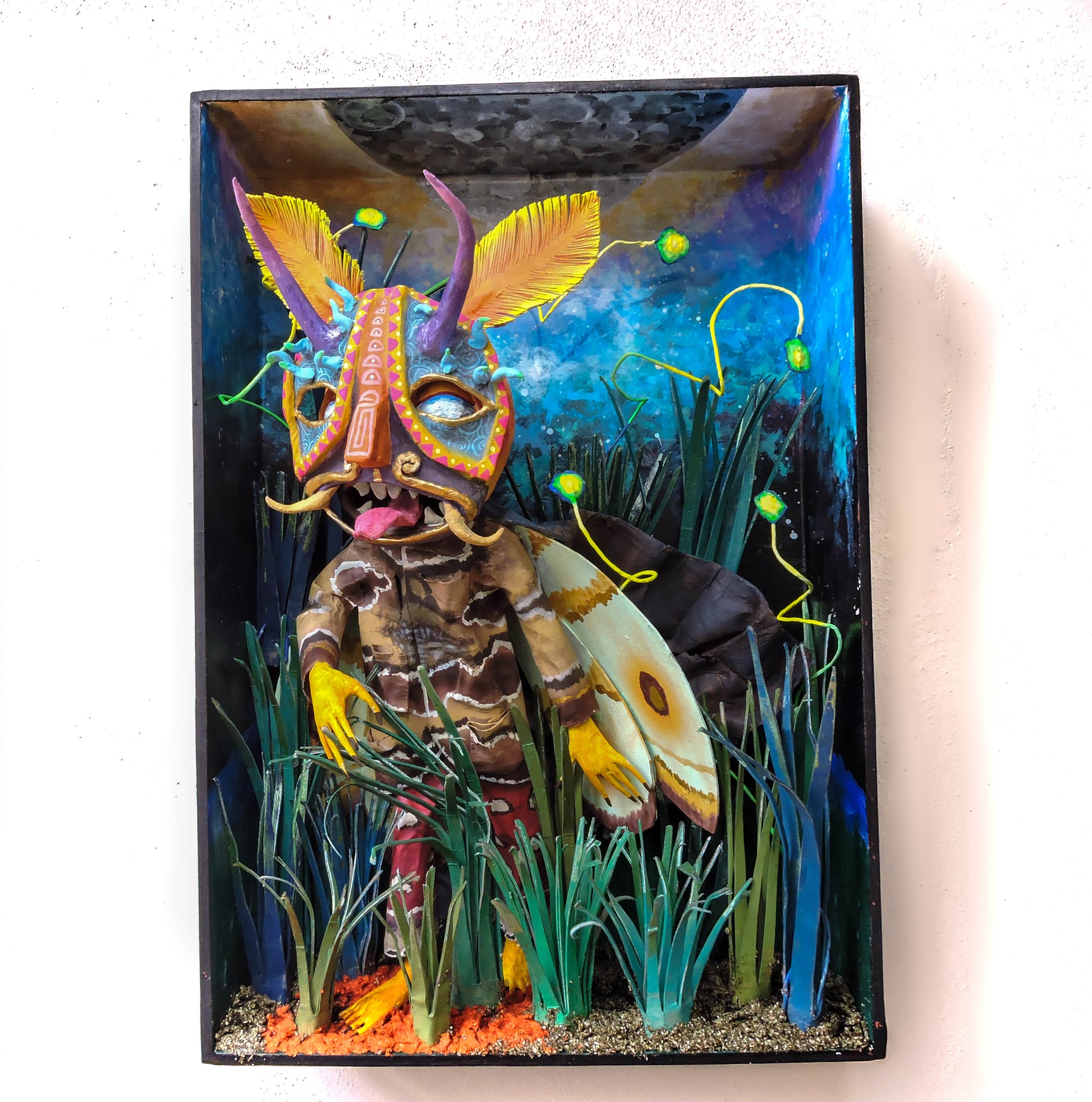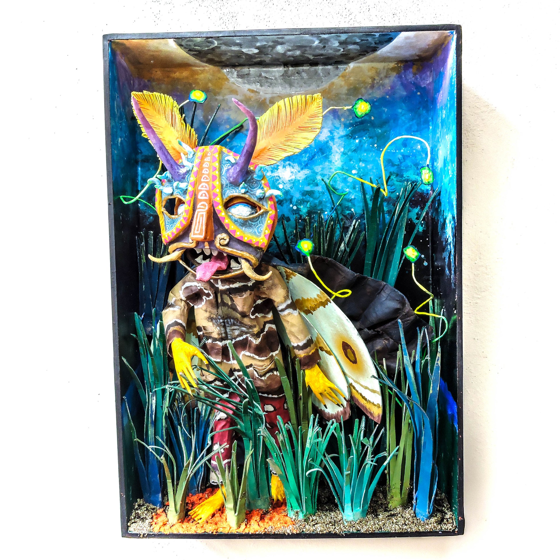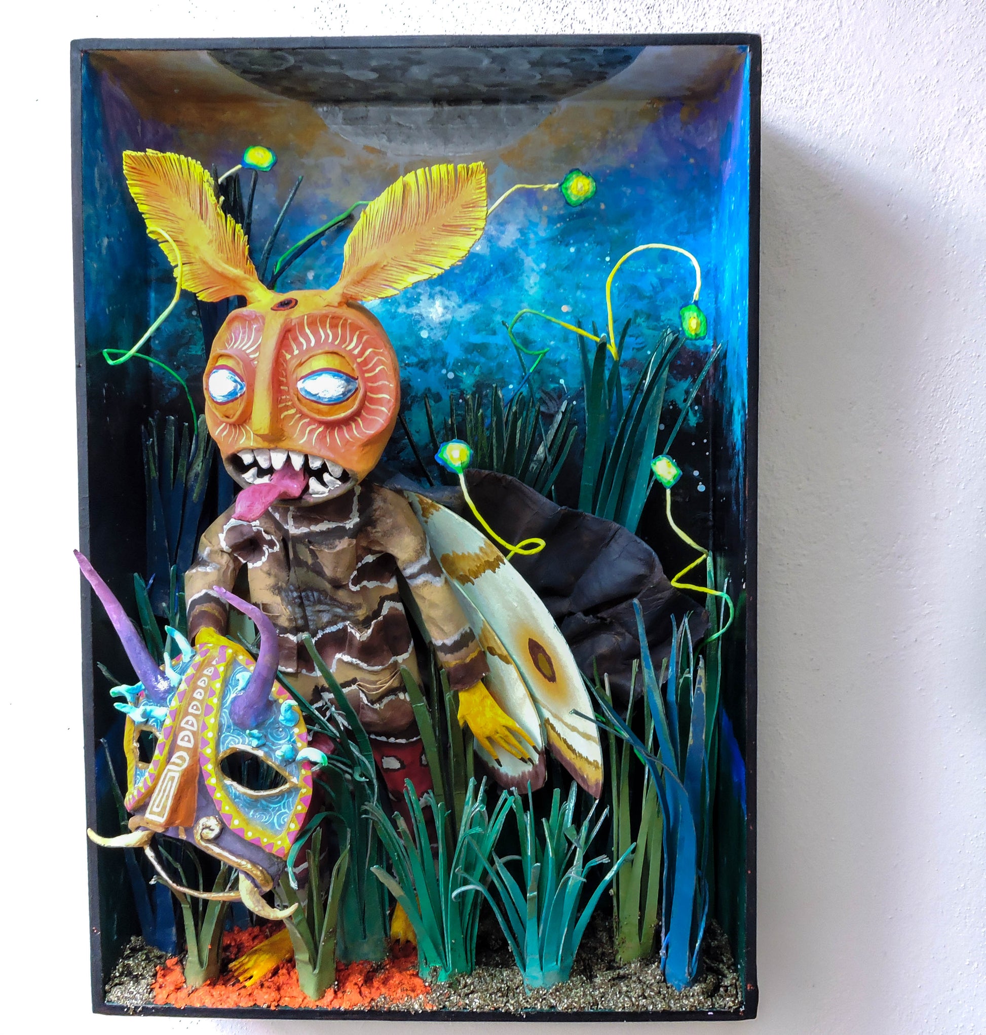esta pieza esta inspirada en esta cita del libro "relatos de poder, Carlos Castañeda" es una escena donde menciona que el cnocimiento es una polilla por que nosotros somos una liz que resplandece, lo que compone nuestro ser es un objeto luminoso, esta escultura representa el momento justo en que Carlos se encuentra con este conocimiento, es una pieza unica, que forma parte de la Oniromaqvina y de el mundo de sus personajes