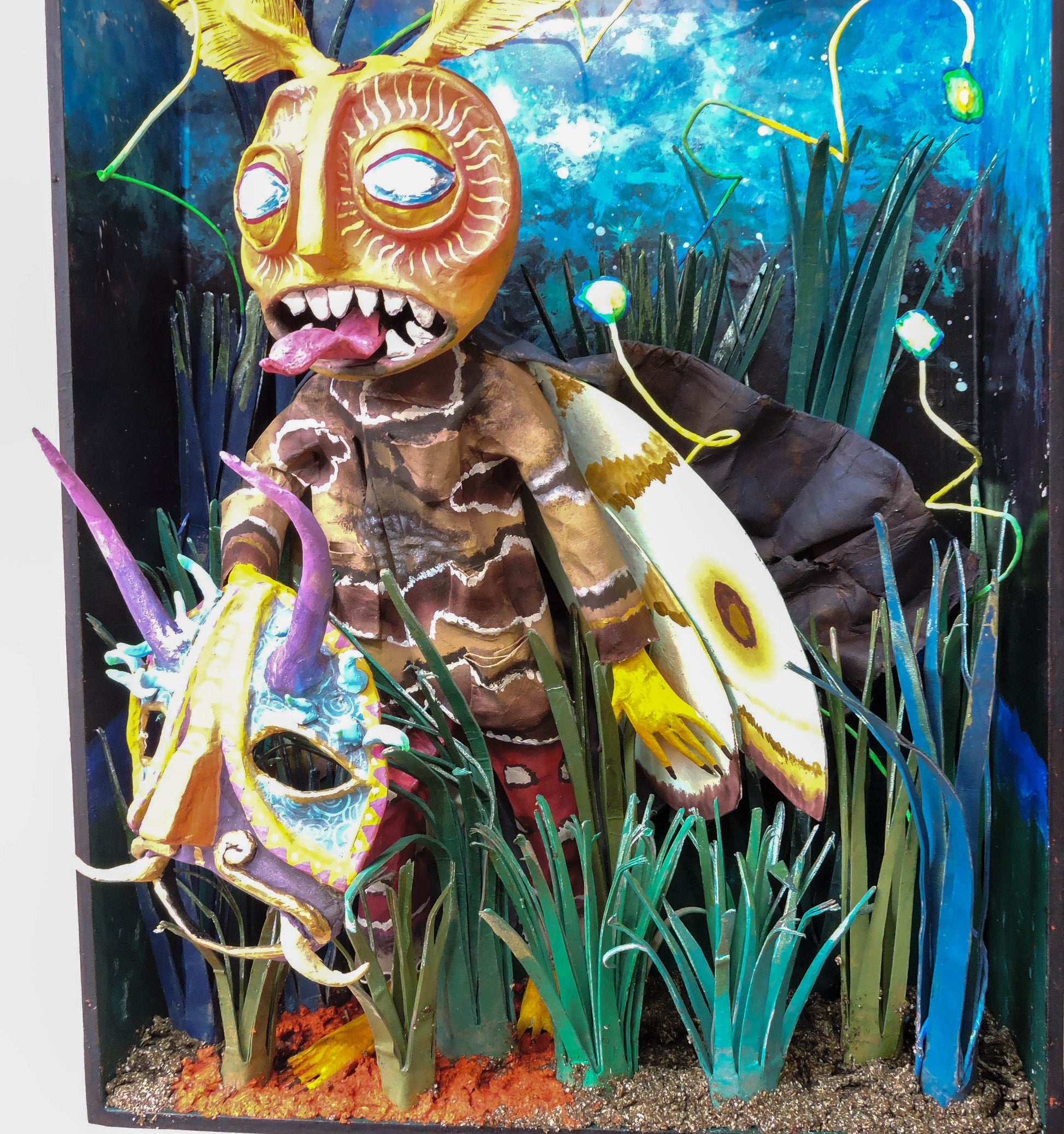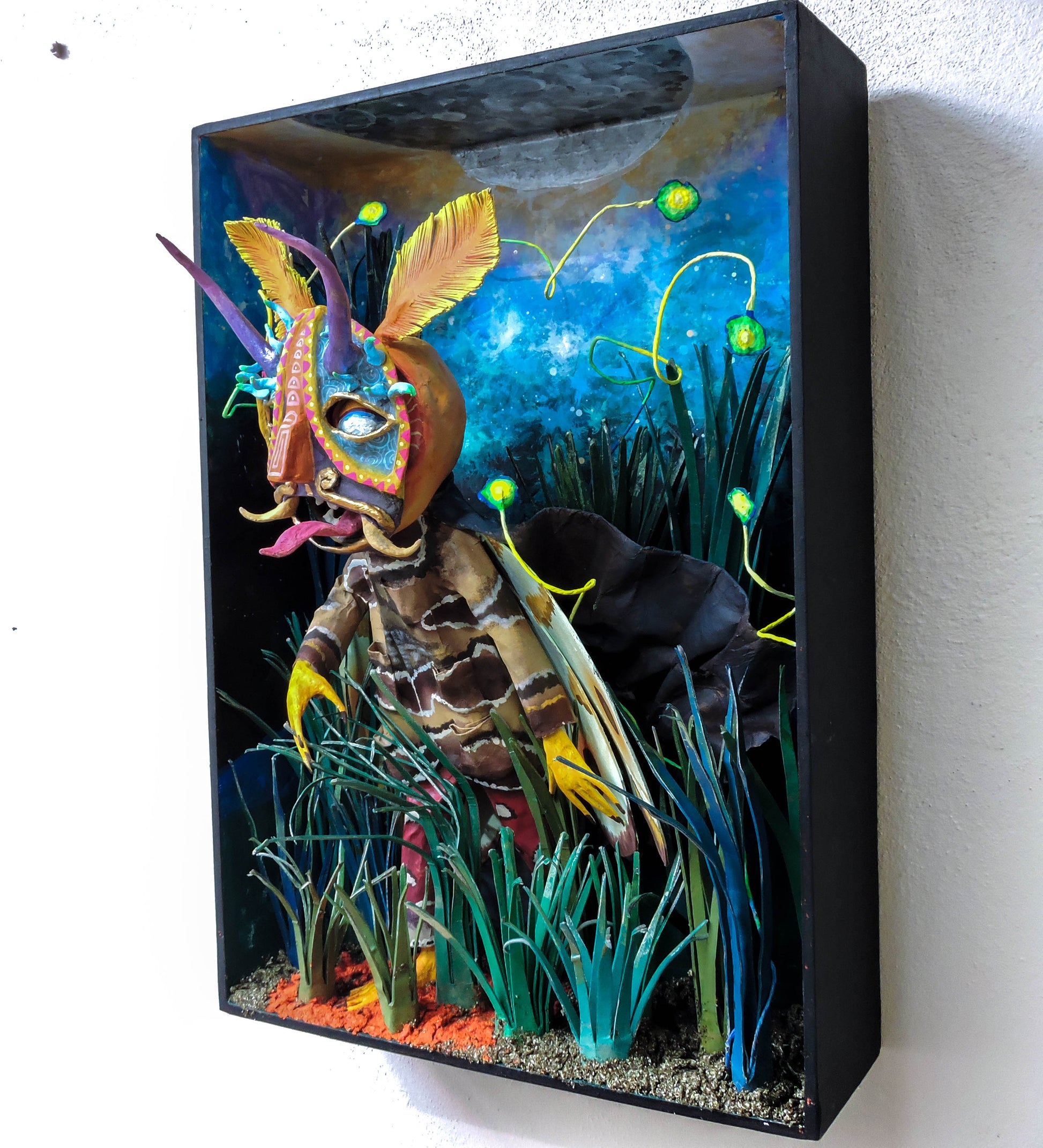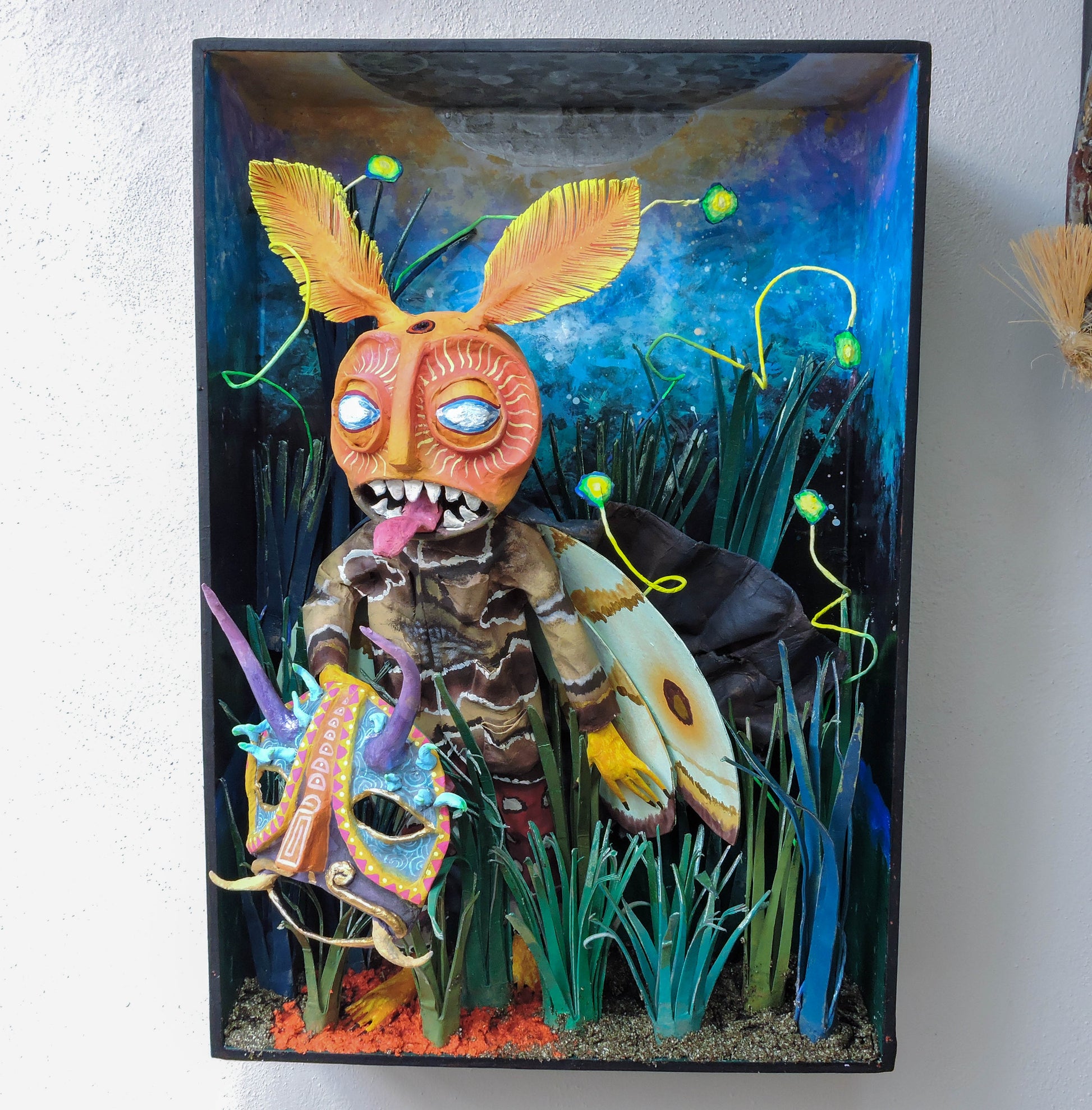 esta pieza esta inspirada en esta cita del libro "relatos de poder, Carlos Castañeda" es una escena donde menciona que el cnocimiento es una polilla por que nosotros somos una liz que resplandece, lo que compone nuestro ser es un objeto luminoso, esta escultura representa el momento justo en que Carlos se encuentra con este conocimiento, es una pieza unica, que forma parte de la Oniromaqvina y de el mundo de sus personajes