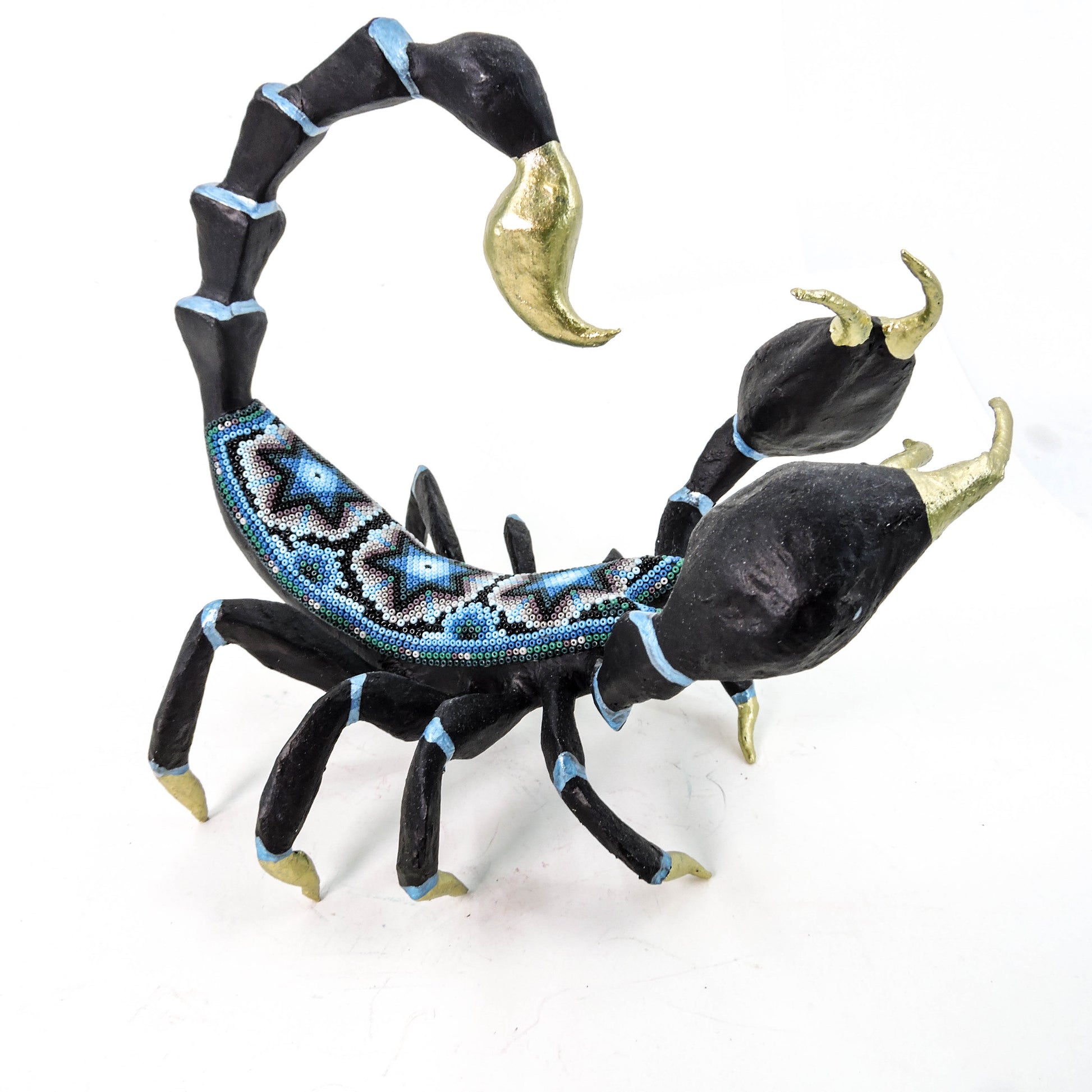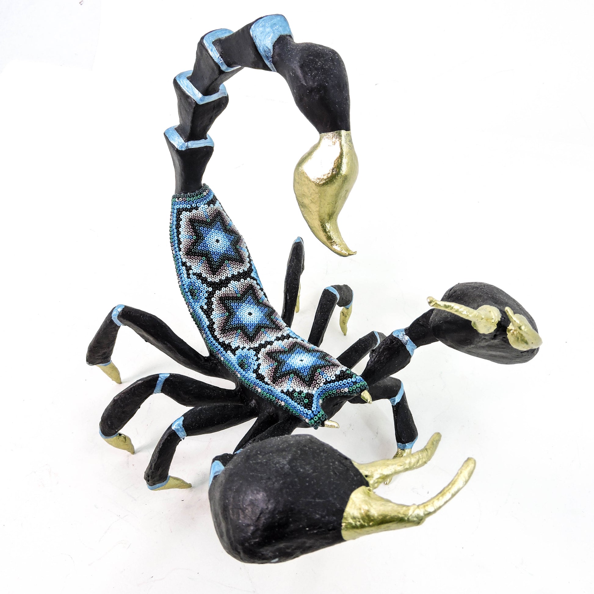Cada pieza es una obra de talento y paciencia, pues cada una de las chaquiras es pegada a mano, para formar los patrones de la cosmogonia wixarika.