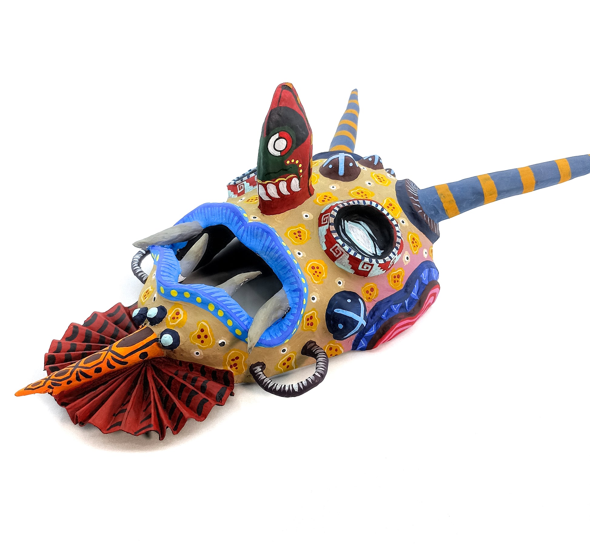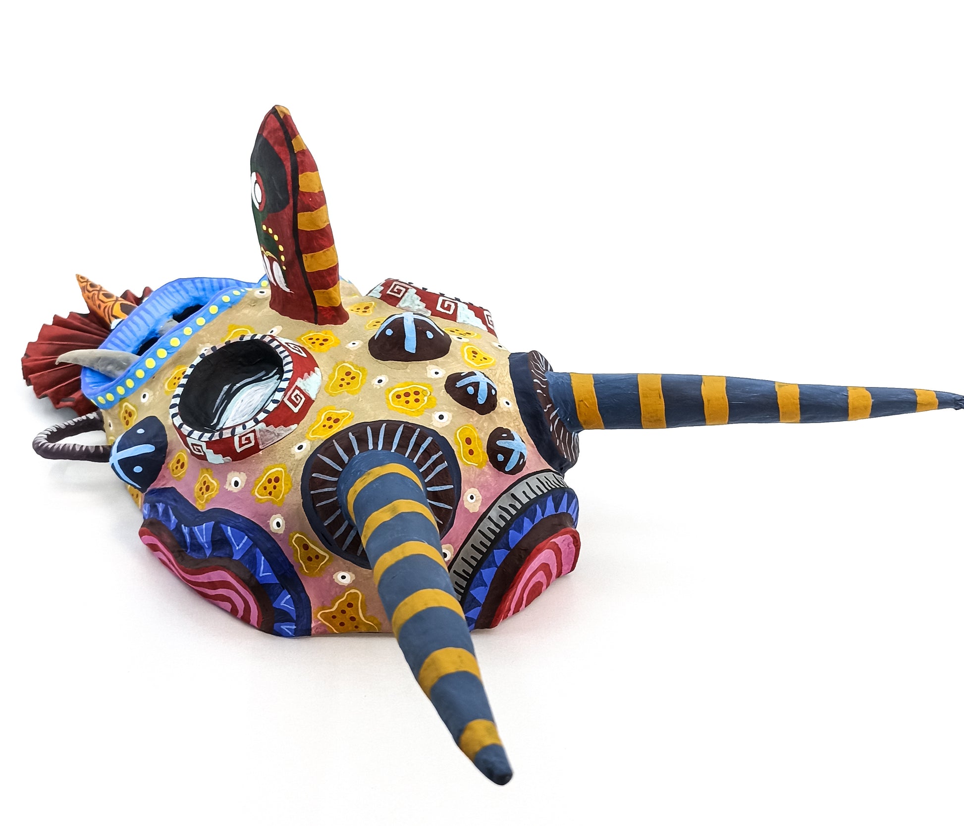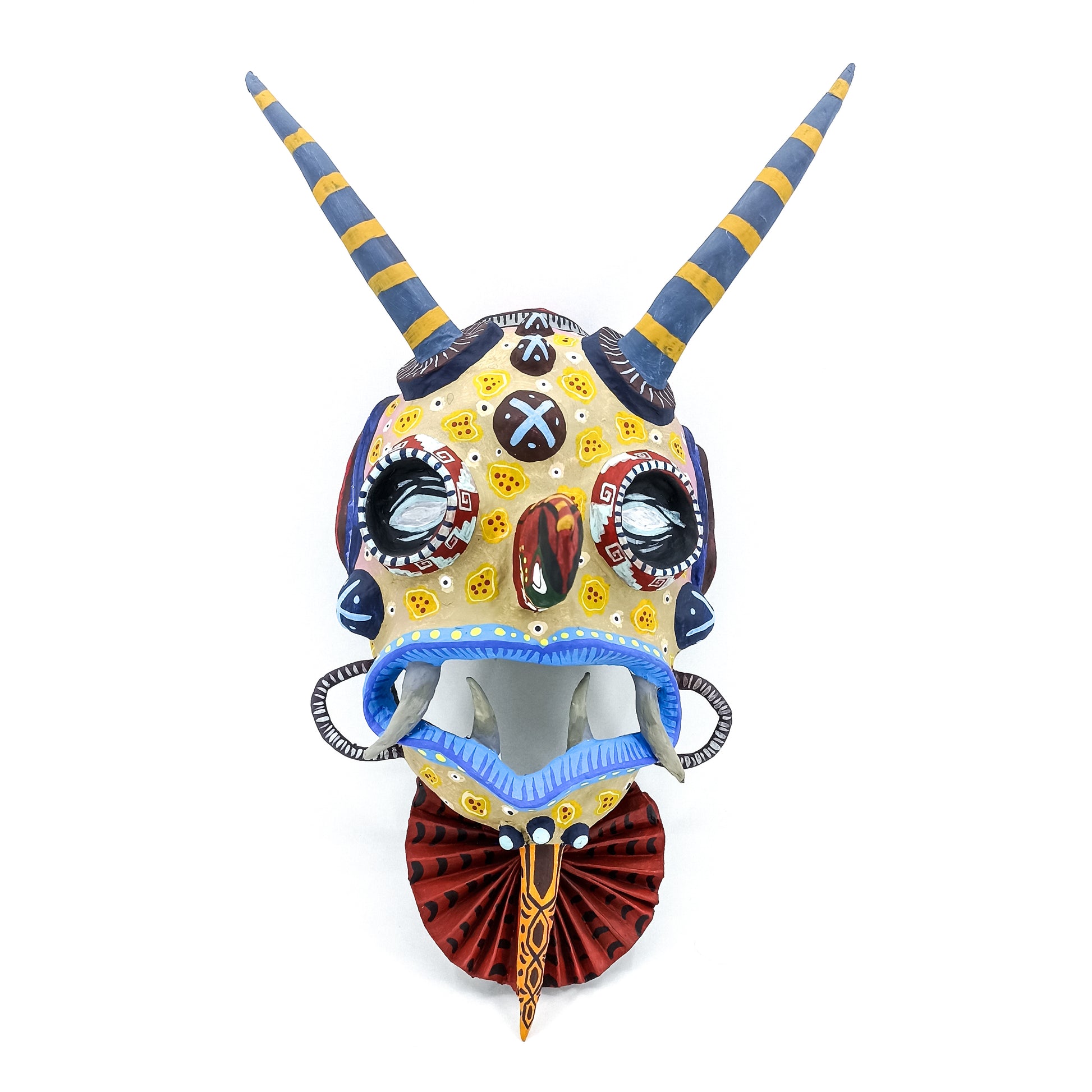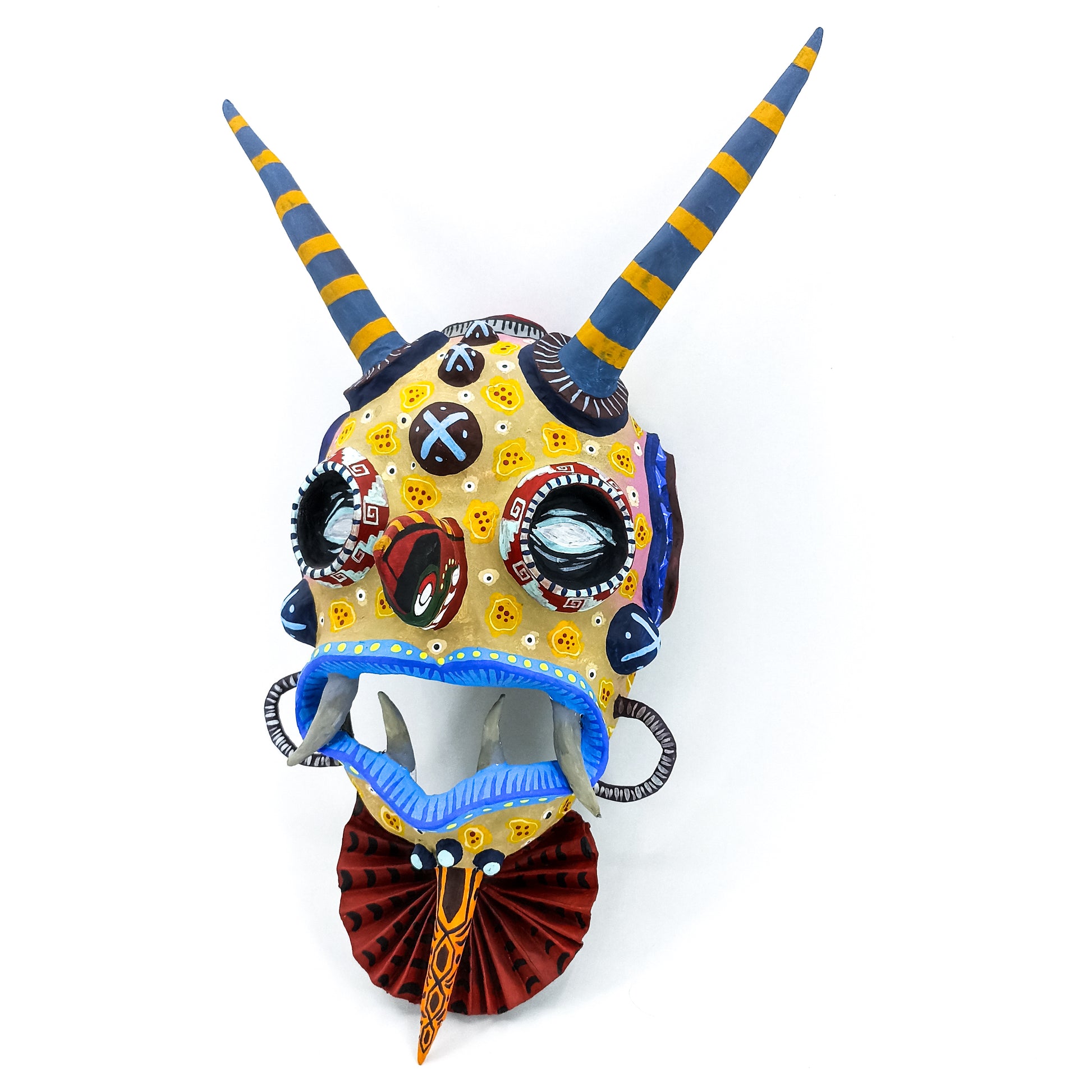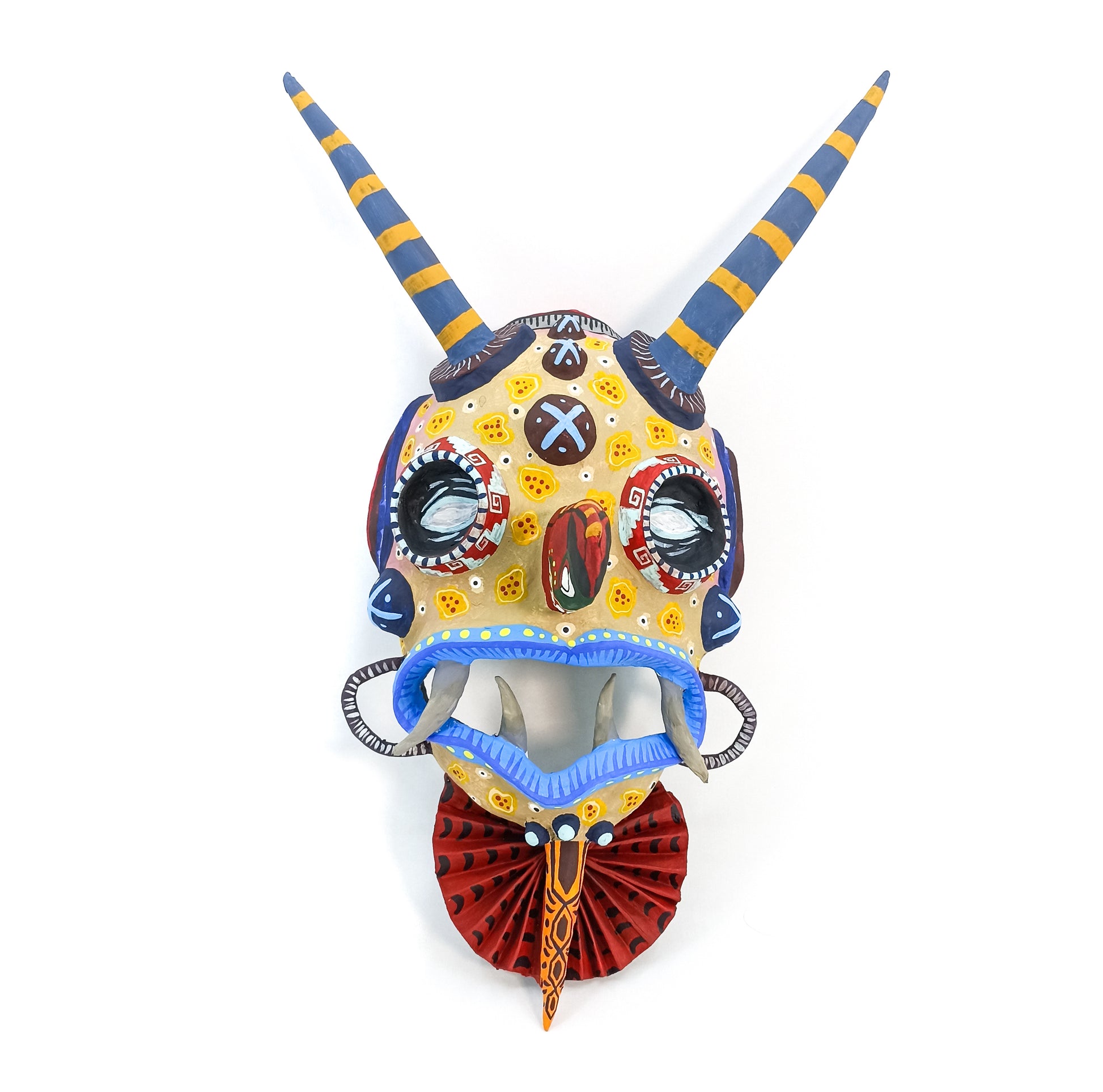 Mascara elaborada en cartoneria en el taller Nahualcalli, sin la utilizacion de moldes, esta serie de cuatro mascaras proviene de una serie de ideas que tuve desde el 2018, desde ese entonces e estado desarrollando el concepto de estos personajes, que viven en un lugar imaginario que nombre Neochtitlan, decidi comenzar a plantearlos a traves de estas primeras piezas, con esto doy comienzo a una serie de piezas que estuve planeando desde hace mucho, espero que sea de su agrado y poco a poco les ire contando mas de estos personajes, mientras tanto les presento la primera pieza con unas medidas aproximadas de: