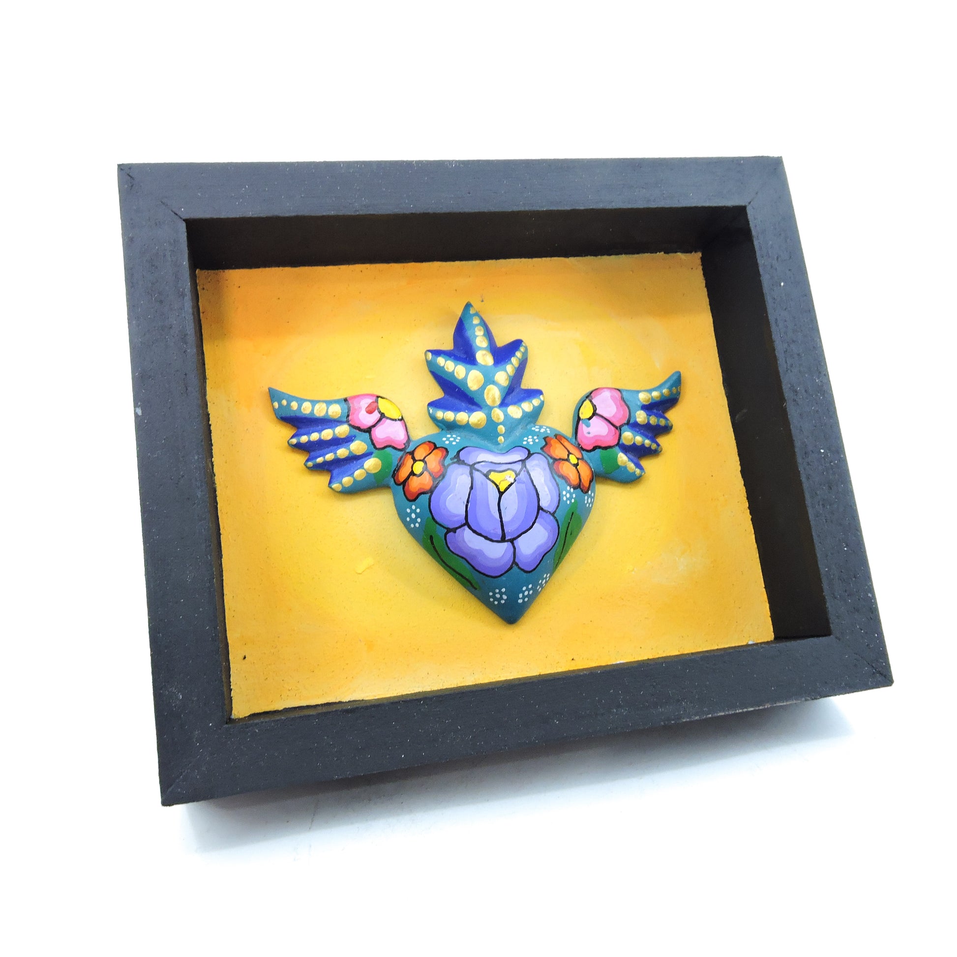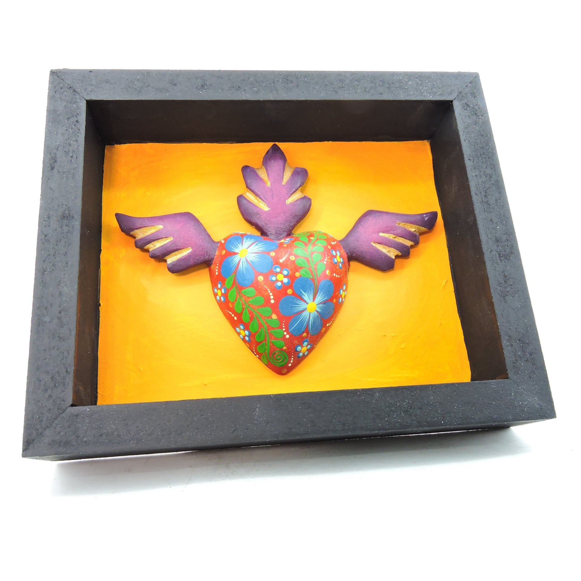 Hermosa artesania, corazon de madera mexicano, conocido como milagro, el corazon esta totalmente tallado en relieve el cuadro incluye un colgante para pared, hecho a mano en el estado de oaxaca, las medidas del nicho son 15x19.5x 4 cm