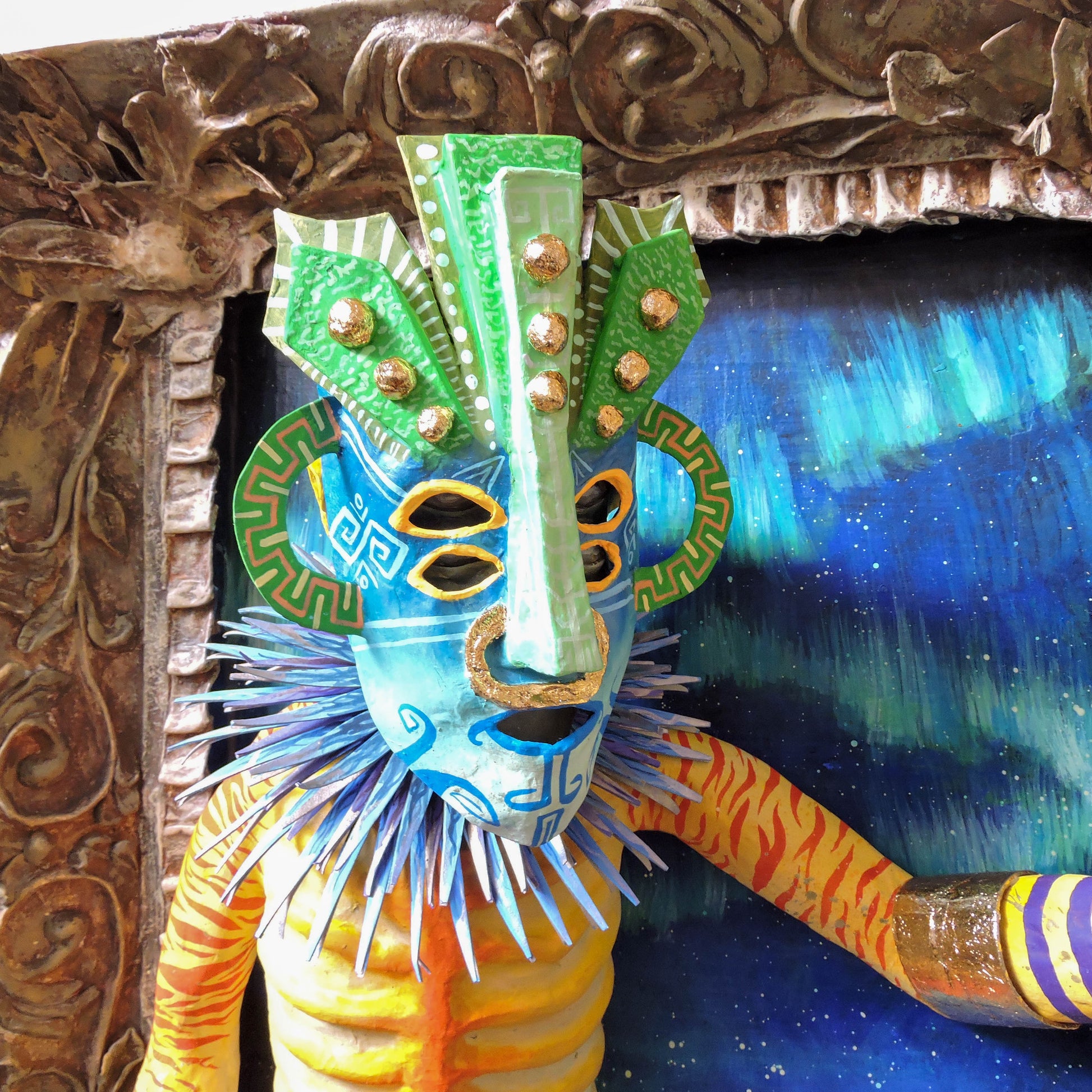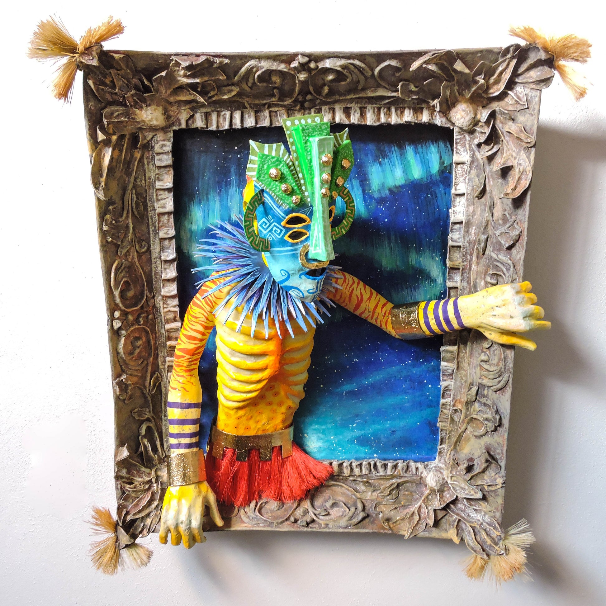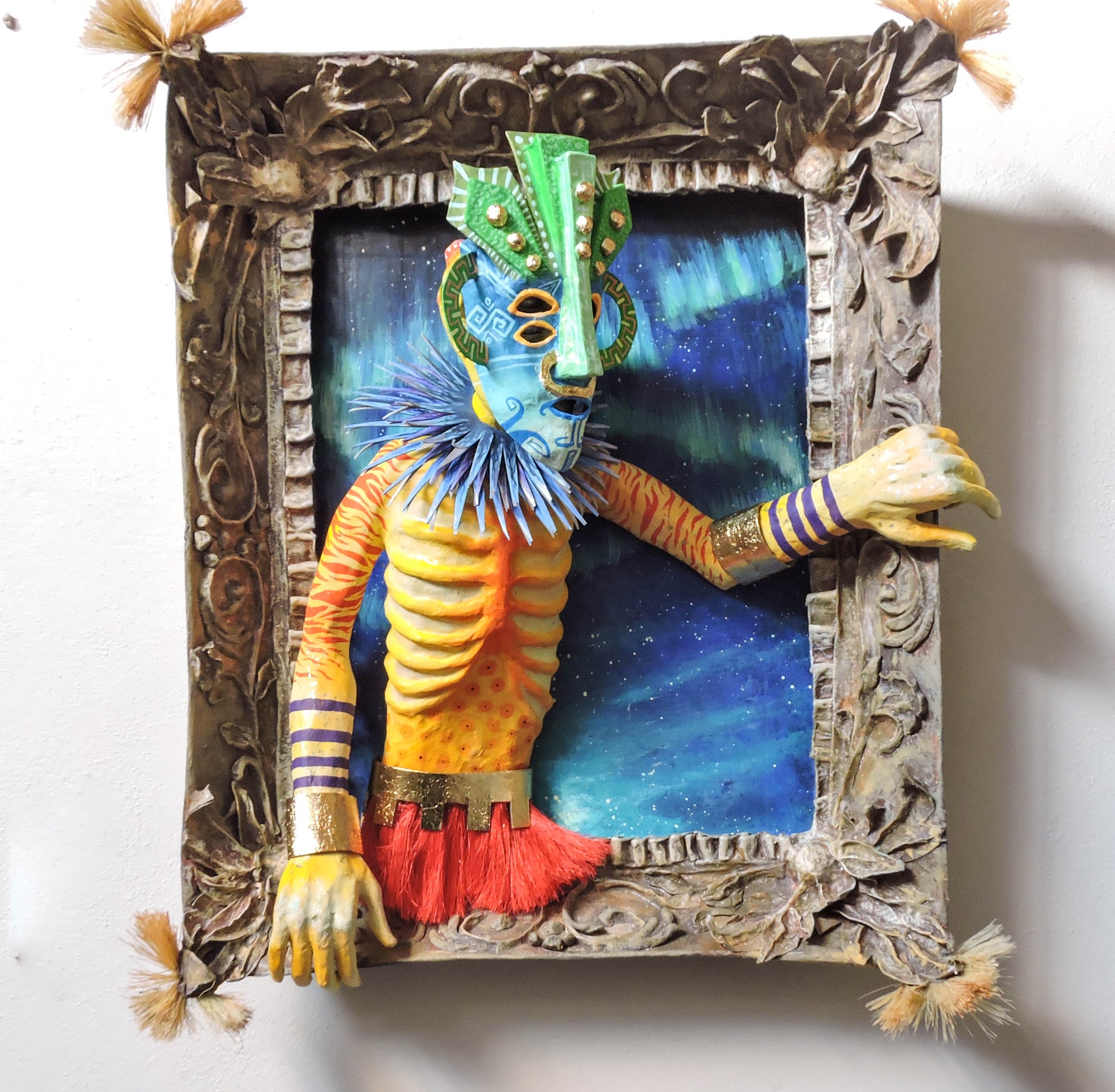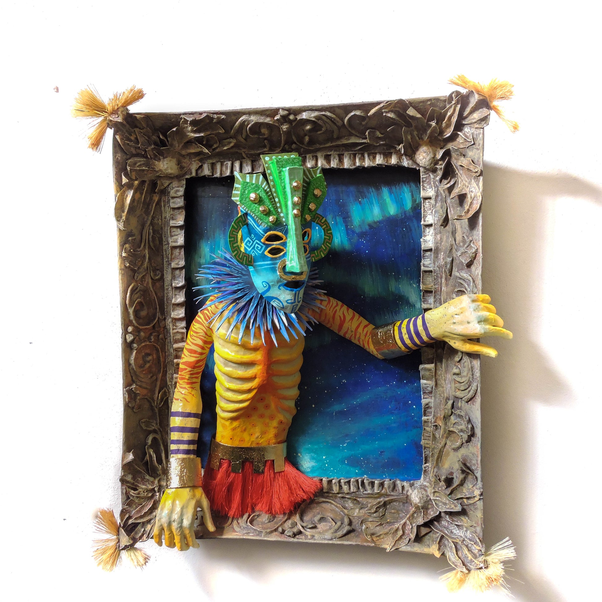 esta pieza esta elaborada en la tecnica de la cartoneria y papel mache, tiene aplicaciones de pan de oro, en sus brazaletes y cinto, asi como en su mascara, es una pieza unica, elaborada en este 2024, es una pieza diseñada para la pared con unas medidas de 65x56x22 cm