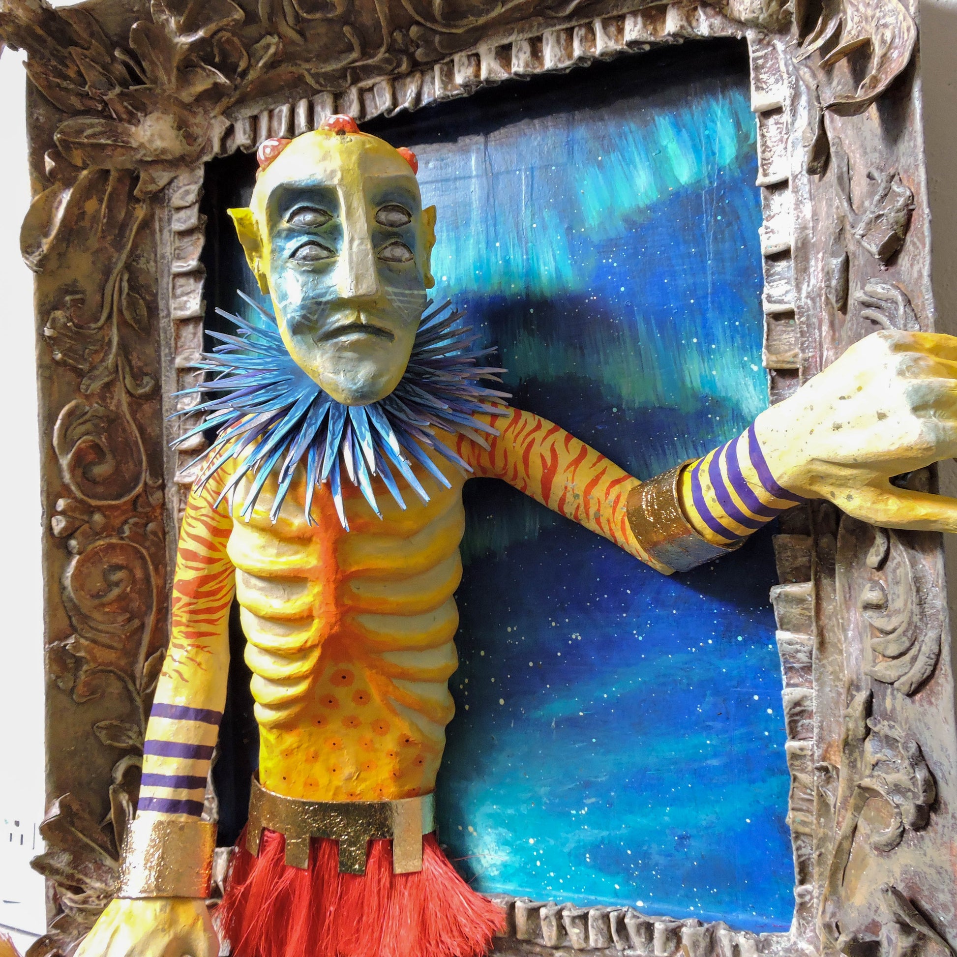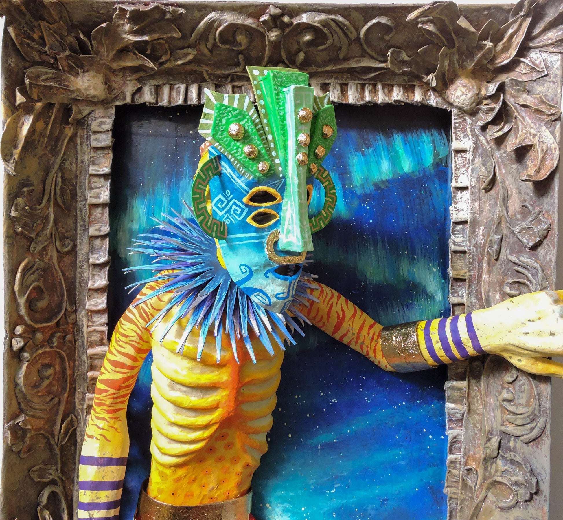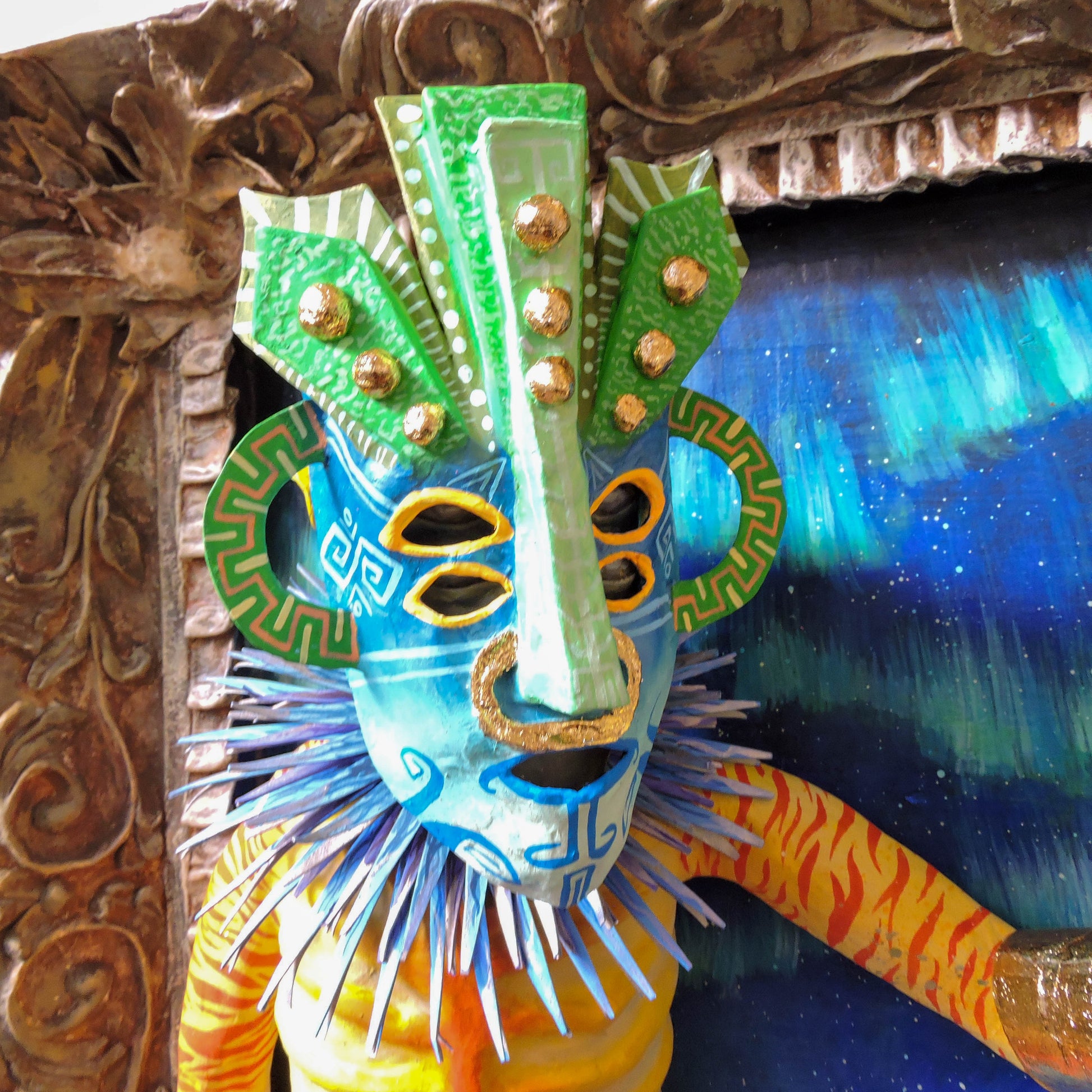 esta pieza esta elaborada en la tecnica de la cartoneria y papel mache, tiene aplicaciones de pan de oro, en sus brazaletes y cinto, asi como en su mascara, es una pieza unica, elaborada en este 2024, es una pieza diseñada para la pared con unas medidas de 65x56x22 cm