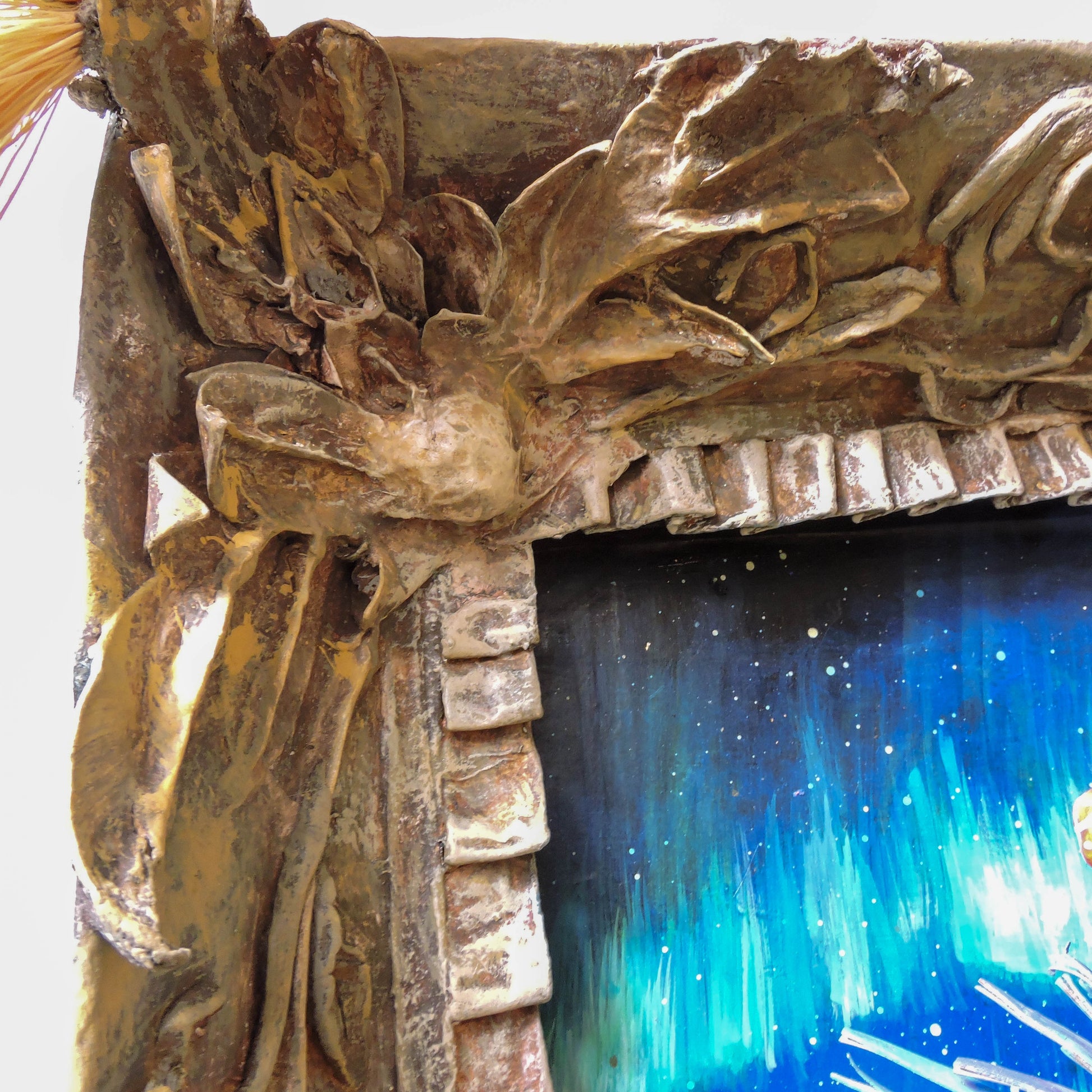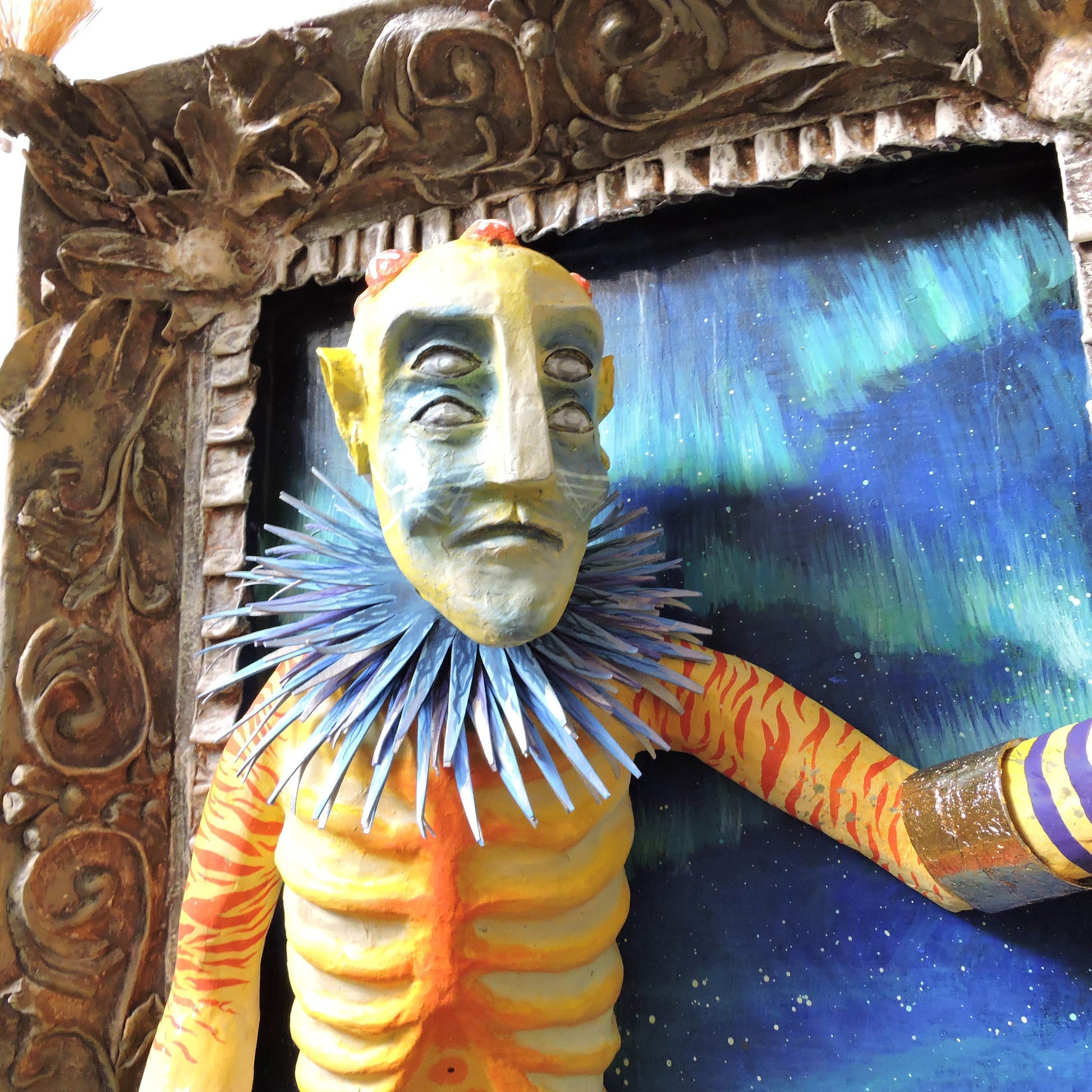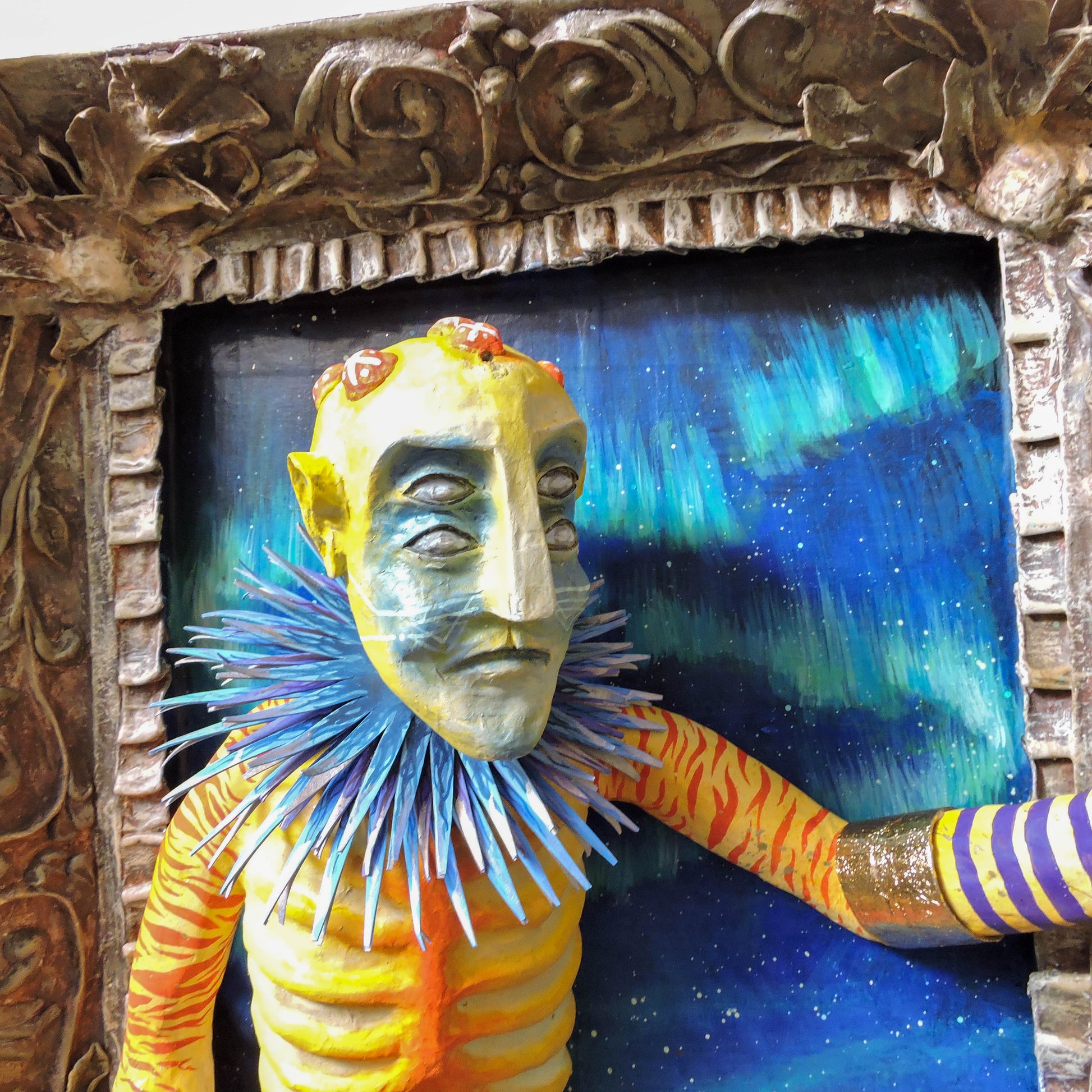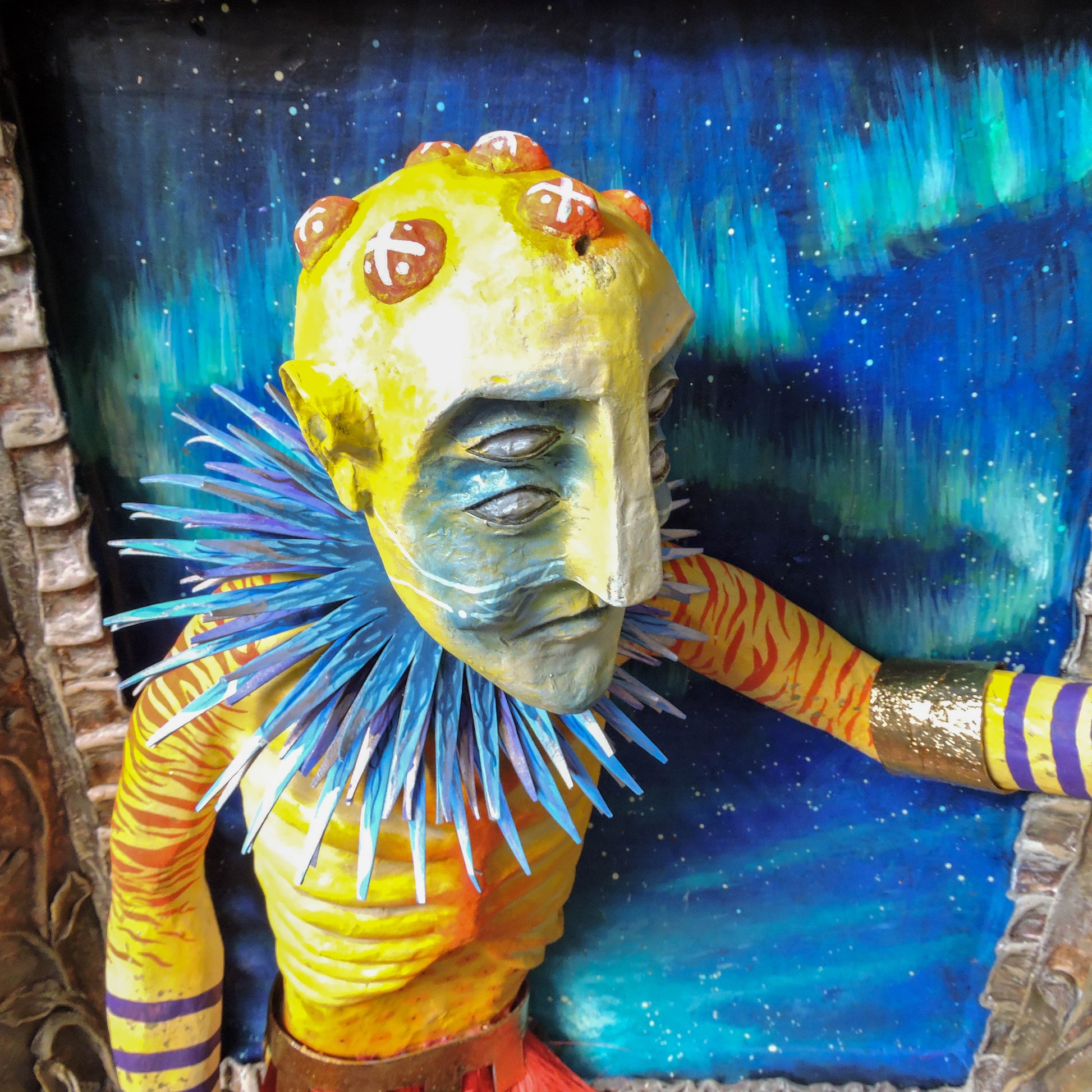 esta pieza esta elaborada en la tecnica de la cartoneria y papel mache, tiene aplicaciones de pan de oro, en sus brazaletes y cinto, asi como en su mascara, es una pieza unica, elaborada en este 2024, es una pieza diseñada para la pared con unas medidas de 65x56x22 cm