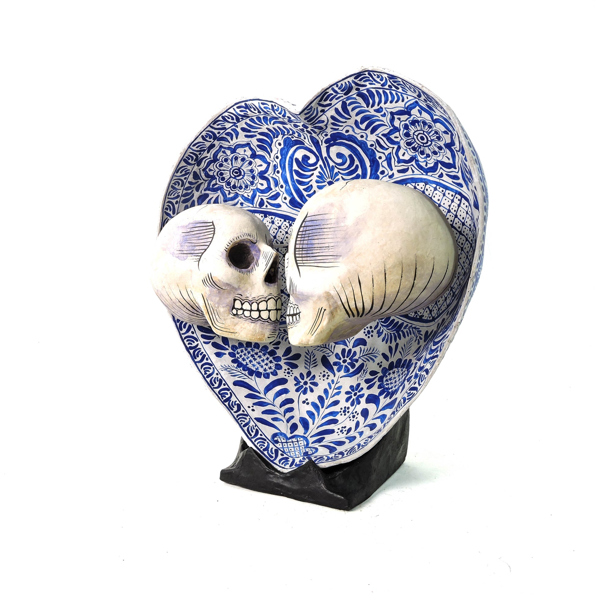 Imagina a dos calaveras enamoradas, sus cráneos besándose tiernamente, atrapados en un instante eterno de amor puro. Esta escultura mexicana es una fusión mágica de tradición y creatividad, inspirada en la Talavera y la porcelana china, pero con un toque único que solo el esqueleto de papel maché puede ofrecer.