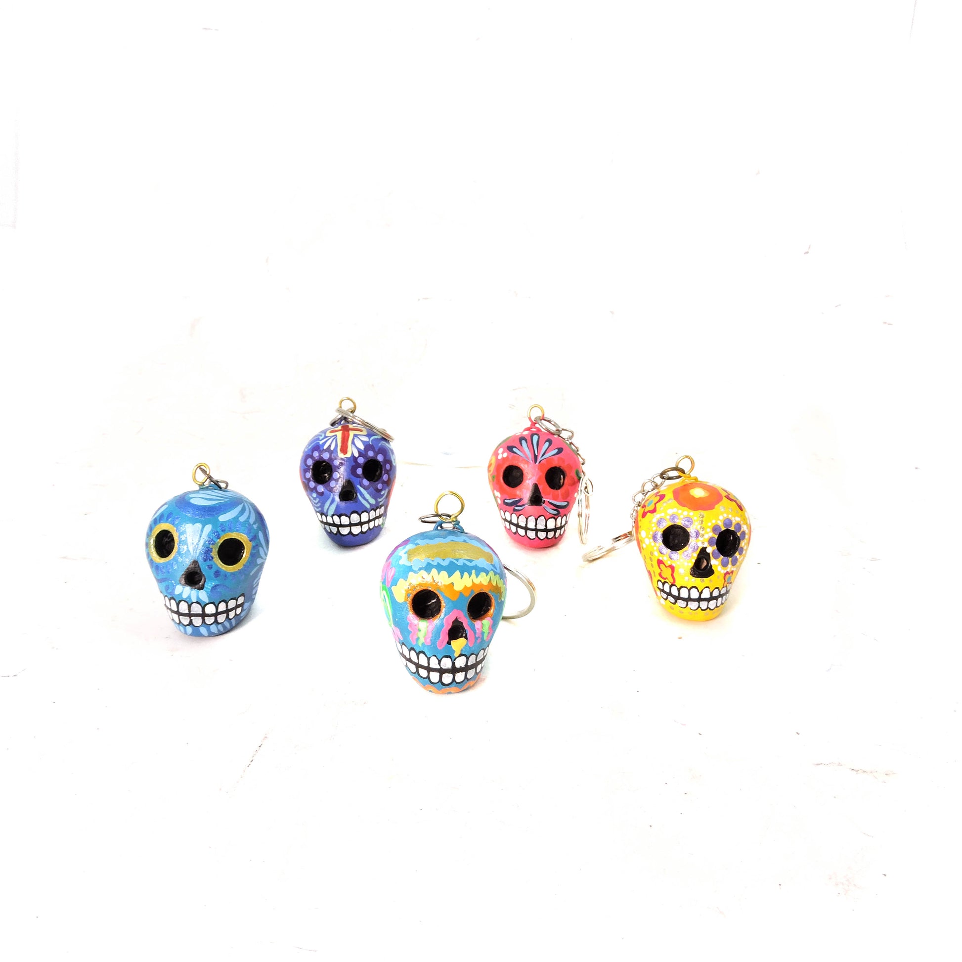 Hermosos llaveros en forma de calavera elaboradas a mano en barro de alta temperatura, cada pieza fue pintada a mano con un estilo unico y especial, cada uno tiene unas medidas aproximadas, de 4x4 cm.