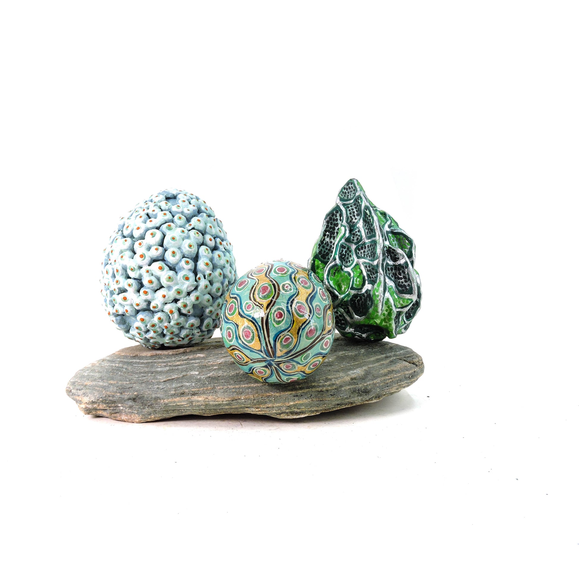 una de las primeras ideas del taller fue crear estas figuras extrañas, las llamamos Huevos de Alebrije, la idea surgió de una simple pregunta, ¿De dónde nacen estos seres estéreos?, cada huevo al igual que su forma son únicos al igual que un Alebrije. la teoría es que los huevos simplemente aparecen, sin ningún origen aparente, y cuando están listos eclosionan en un hermoso Alebrije.